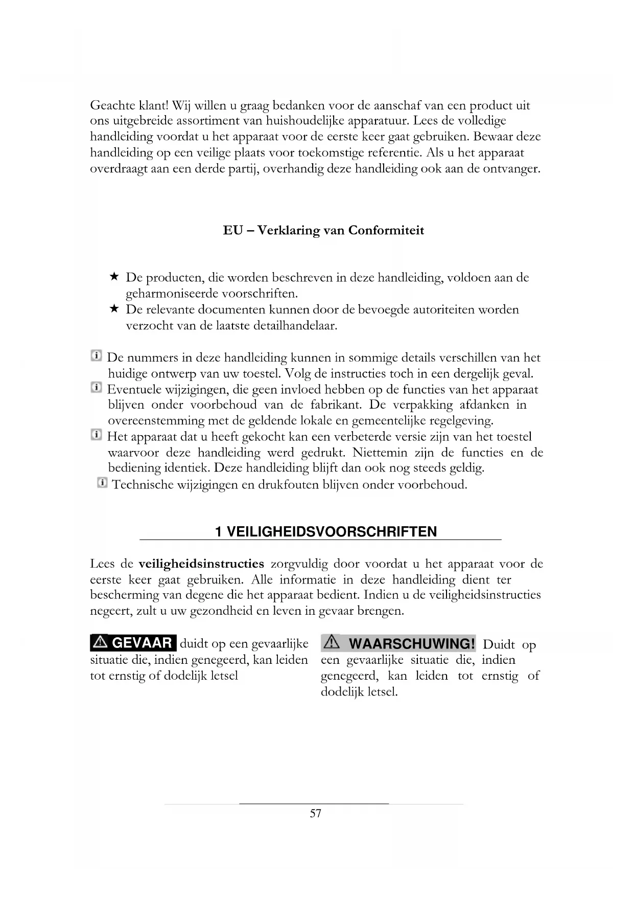 Gcachte klant! Wij wilten u graag bedanken voor dc aanschaf van een productuit ons uitgebreide assortment van huishoudelijkke apparatuur. Lees de volledige handleiding voordat u het apparaat voor de eerste koer gaat gebruiken. Bewaar deze handleiding op een veilige plaats voor toekomstige referentie. Als u het apparaat overdraagt aan een derde partij, overhandig deze handleiding ook aan de ontvanger.
