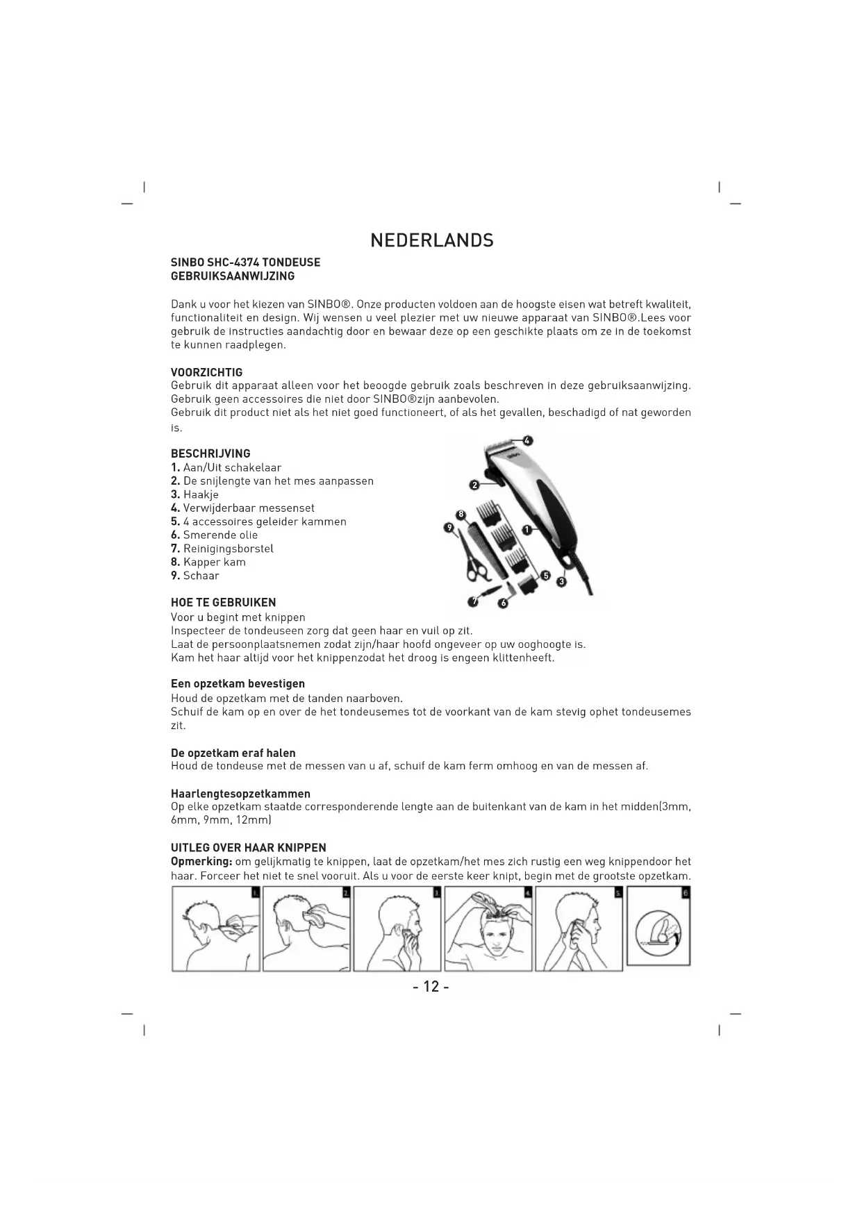 Een apparaat mag nooit onbeheerd worden achtergelaten wanneer het aangesloten is op een stopcontact. Houd de stekker en het snoer uit de buurt van warme oppervlakken. Zorg dat de stekker en het snoer niet nat worden. Steek detondeuseniet met natte handen in het stopcontact entrek het er niet uit. Gebruik het product niet met een beschadigd snoer. Vervangend materiaal kan worden verkregen viahet servicecentervan SINBO®. Opladen, bewaren en gebruik van het product moet gebeuren bij een temperatuur tussen 15˚C en 35˚C. Haal altijd de stekker uit het stopcontact tijdens het schoonmaken. Gebruik alleen de bij het apparaat geleverde onderdelen. Houd dit product buiten het bereik van kinderen. Het gebruik van het apparaat door personen met verminderde lichamelijke, zintuiglijke of verstandelijke vermogens of gebrek aan ervaring en kennis,kan risicovol zijn. De personen die verantwoordelijk zijn voor hun veiligheid moeten expliciete instructies geven of toezicht houden op het gebruik van het apparaat. KENMERKEN - Verwijderbaar messenset voor eenvoudige reiniging - Fijn malend roestvrij stalen mes - Zelf scherpende messen - Super magnetische motor - Uitstekende scherpte - Drukknop: voor maximum styling - 4 geleider kammen: voor uiteenlopende lengten en styling opties Accessoires: - 1x schaar - 1x haarkapper kam - 1x reinigingsborstel- 15 - - 1x smeerolie - 1x mes afscherming - 4x snijgeleiders (3, 6, 9,12mm) - AC230V, 50Hz, 9W MILIEUBESCHERMING Gooi de tondeusewanneer hij versleten is niet weg bij het huishoudelijk afval. Afvalverwerking kan plaatsvinden bij hetservicecenter van SINBO® of bij speciale inzamelplaatsen.- 16 - DEUTSCH