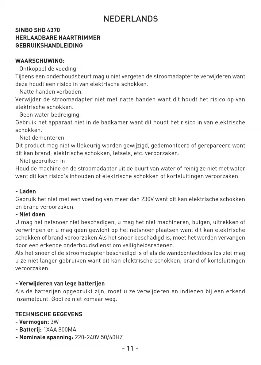 Arrêtez l’alimentation électrique et retirez la lame. Pour éviter que la lame ne saute, tenez-la de l’autre main.- 11 - NEDERLANDS SINBO SHD 4370 HERLAADBARE HAARTRIMMER GEBRUIKSHANDLEIDING WAARSCHUWING: - Ontkoppel de voeding. Tijdens een onderhoudsbeurt mag u niet vergeten de stroomadapter te verwijderen want deze houdt een risico in van elektrische schokken. - Natte handen verboden. Verwijder de stroomadapter niet met natte handen want dit houdt het risico op van elektrische schokken. - Geen water bedreiging. Gebruik het apparaat niet in de badkamer want dit houdt het risico in van elektrische schokken. - Niet demonteren. Dit product mag niet willekeurig worden gewijzigd, gedemonteerd of gerepareerd want dit kan brand, elektrische schokken, letsels, etc. veroorzaken. - Niet gebruiken in Houd de machine en de stroomadapter uit de buurt van water of reinig ze niet met water want dit kan risico's inhouden of elektrische schokken of kortsluitingen veroorzaken. - Laden Gebruik het niet met een voeding van meer dan 230V want dit kan elektrische schokken en brand veroorzaken. - Niet doen U mag het netsnoer niet beschadigen, u mag het niet machineren, buigen, uitrekken of verwringen en u mag geen gewicht op het netsnoer plaatsen want dit kan elektrische schokken of brand veroorzaken Als het snoer beschadigd is, moet het worden vervangen door een erkende onderhoudsdienst om veiligheidsredenen. Als het snoer of de stroomadapter beschadigd is of als de wandcontactdoos los ziet mag u ze niet langer gebruiken want dit kan elektrische schokken, brand of kortsluitingen veroorzaken. - Verwijderen van lege batterijen Als de batterijen opgebruikt zijn, moet u ze verwijderen en indienen bij een erkend inzamelpunt. Gooi ze niet zomaar weg. TECHNISCHE GEGEVENS - Vermogen: 3W - Batterij: 1XAA 800MA - Nominale spanning: 220-240V 50/60HZ- 12 - - Adapter uitvoer: 3V300MA - Laadduur: ca. 8 uur - Operationele duur: 45mins OPGELET OPMERKINGEN - Om het de eerste maal te gebruiken of als het nog nooit werd gebruikt gedurende zes maanden na aankoop. Laat het product 3 uur opladen om de batterijen volledig op te laden. Als het product wordt opgeladen als de secundaire batterij volledig ontladen is, kan het laadlampje niet onmiddellijk oplichten en het schakelt na een aantal minuten over op normaal. - Voor een optimaal gebruik van de trimmer mag u geen olie laten druppelen op de messen. Tijdens de lading en het gebruik van het apparaat zal het opwarmen. Dit is normaal. Let op: GEBRUIK GEEN BENZINE, ALCOHOL EN ANDERE OLIËN - Uit de buurt van water houden. Niet gebruiken in een zwembad, badkuip of andere vloeistofcontainer met water. - Laad de haartrimmer aan een temperatuur van 0˚C~35˚C. Het verpakkingsmateriaal (plastic zak, kartonnen doos, etc.) moet uit de buurt van kinderen worden gehouden. Ze houden namelijk risico's in.