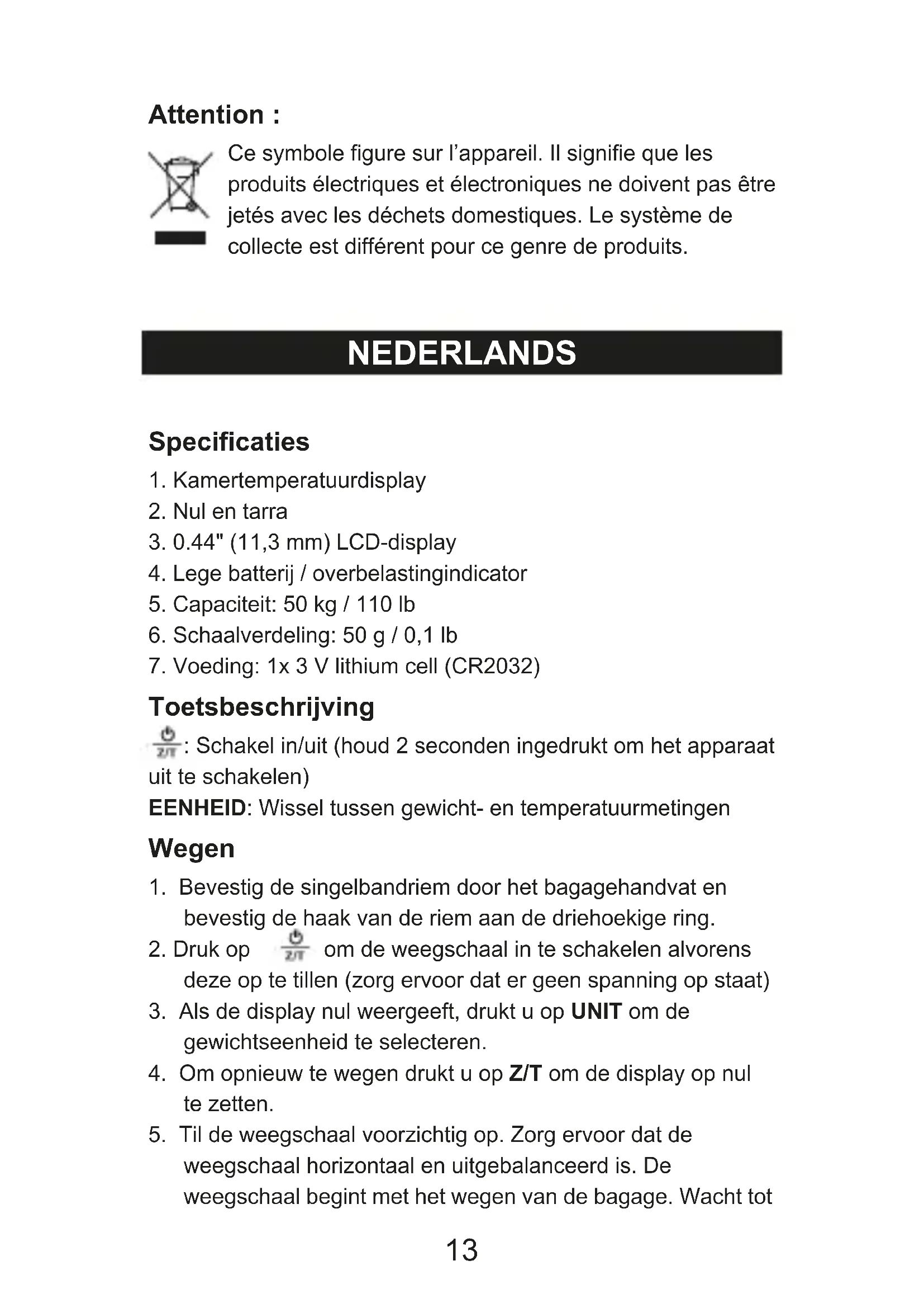uw bagage te lezen, druk op Z/T om de display op nul te zetten en probeer het opnieuw. De weegschaal wordt na 1 minuut inactiviteit automatisch uitgeschakeld. Voeding De weegschaal wordt door 1x 3 V (CR2032) lithium-ion batterij gevoed. Wanneer u de weegschaal voor de eerste keer gebruikt, dient u het klepje van de batterijhouder aan de rechterkant van de weegschaal te openen en de batterij-isolatiestrookje vóór gebruik te verwijderen. De batterij vervangen De LCD zal “Lo” weergeven wanneer de batterij bijna leeg is. Vervang de batterij als volgt: