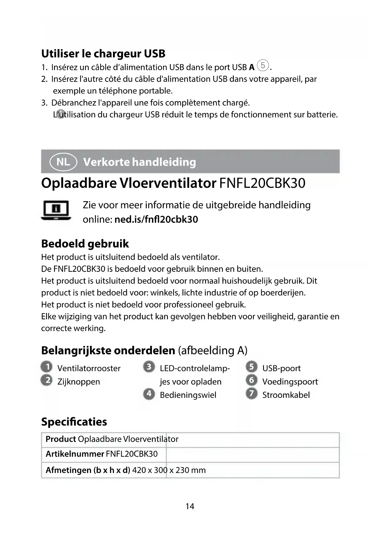Verkorte handleiding Oplaadbare Vloerventilator FNFL20CBK30 Zie voor meer informatie de uitgebreide handleiding online: ned.is/fn20cbk30 Bedoeld gebruik Het product is uitsluitend bedoeld als ventilator.De FNFL20CBK30 is bedoeld voor gebruik binnen en buiten.Het product is uitsluitend bedoeld voor normaal huishoudelijk gebruik. Dit product is niet bedoeld voor: winkels, lichte industrie of op boerderijen.Het product is niet bedoeld voor professioneel gebruik.Elke wijziging van het product kan gevolgen hebben voor veiligheid, garantie en correcte werking. Belangrijkste onderdelen (afbeelding A)