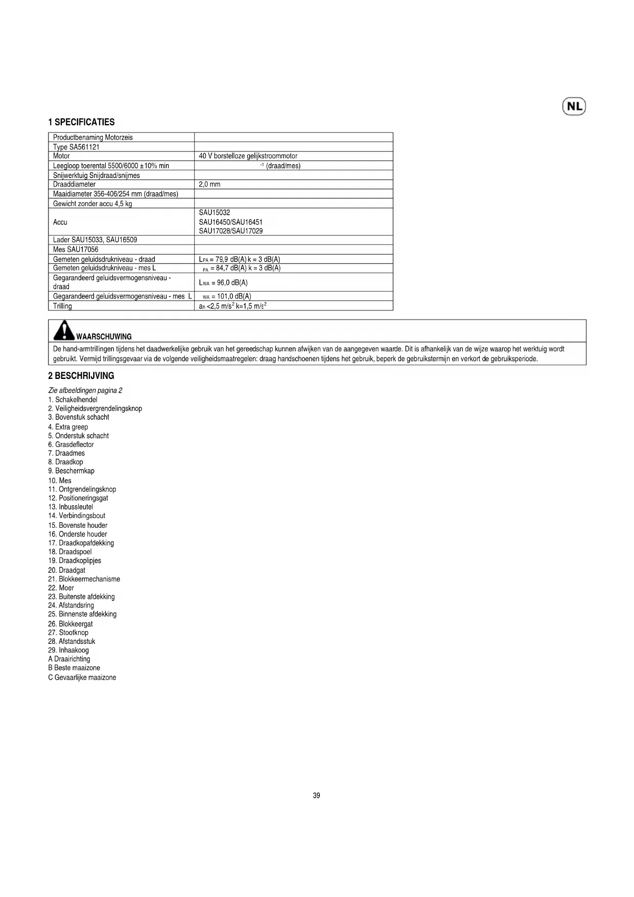 | Gegarandeerd geluidsvermogensniveau - draad | LWA = 96,0 dB(A) |