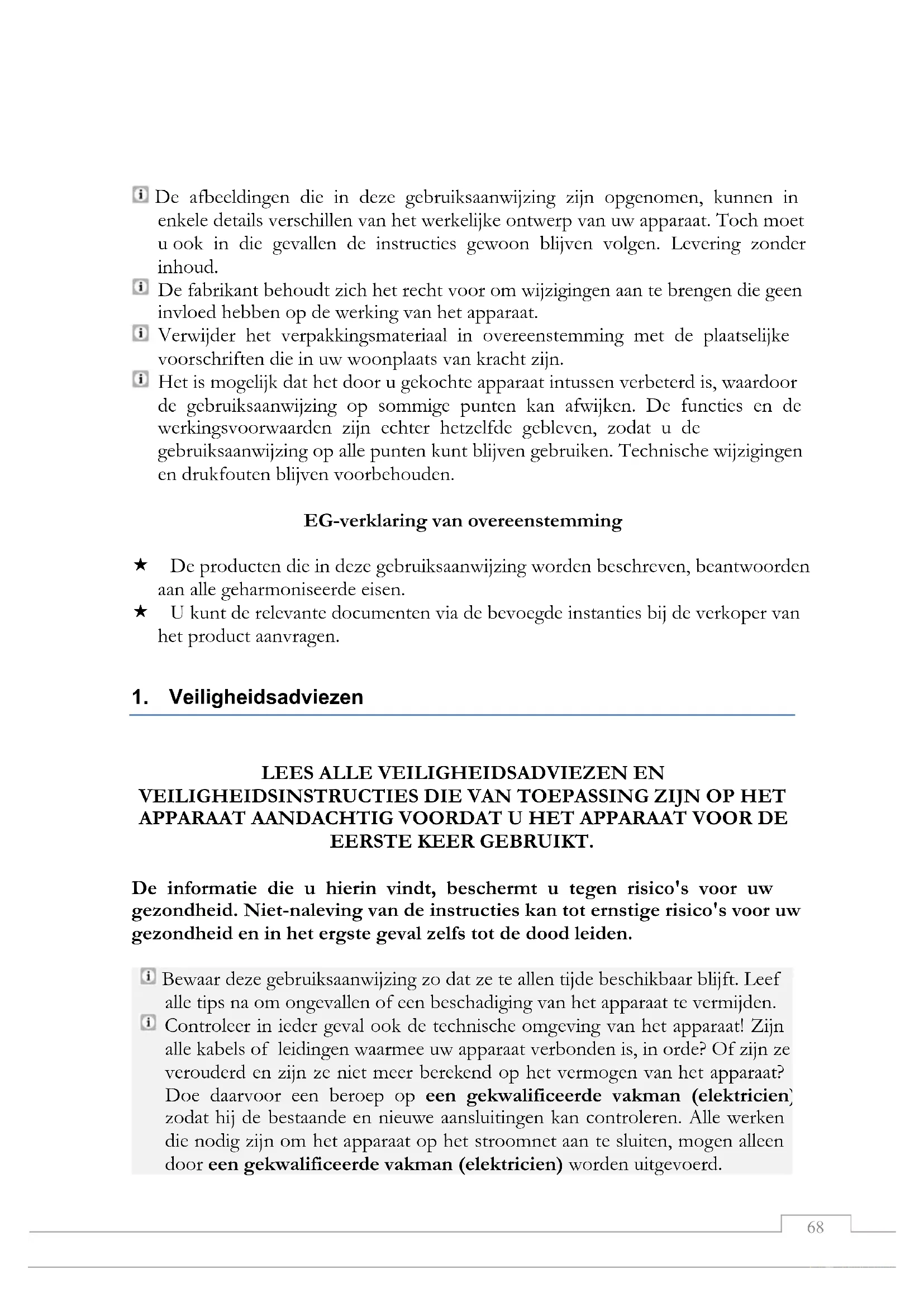 mais non exclusivement, en cas d'incendie ou d'explosion. Le droit de garantie ne prolonge ni la durée de garantie ni ne prévoit une nouvelle garantie. L'applicabilité territoriale de la garantie concerne les appareils achetés et utilisés en Allemagne, en Autriche, en Belgique, au Luxembourg et aux Pays-Bas. August 201467 Beste klant, Allereerst willen we u bedanken omdat u een product uit ons ruime assortiment hebt gekozen. Graag vragen we u om de volledige gebruiksaanwijzing te lezen voordat u het apparaat voor de eerste keer gebruikt. Bewaar deze gebruiksaanwijzing op een veilige plaats, zodat u er ook in de toekomst gemakkelijk gebruik kunt van maken. Geef de gebruiksaanwijzing mee als u het apparaat later aan iemand anders geeft. Inhoud 1. Veiligheidsadviezen .................................................................................................. 68