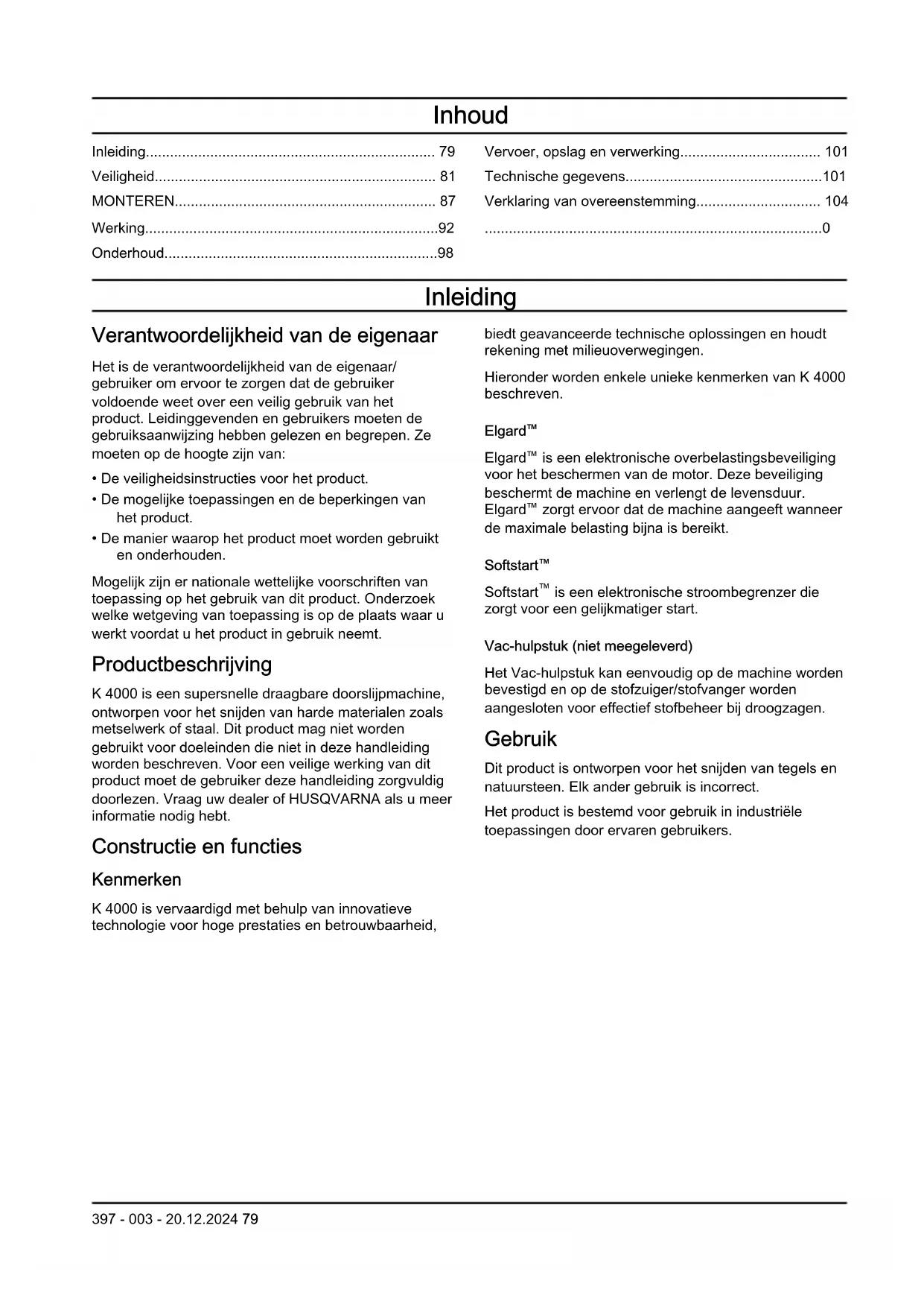 - De manier waarop het product moet worden gebruikt en onderhouden. Mogelijk zijn er nationale wettelijke voorschriften van toepassing op het gebruik van dit product. Onderzoek welke wetgeving van toepassing is op de plaats waar u werkt voordat u het product in gebruik neemt. Productbeschrijving K 4000 is een supersnelle draagbare doorslijpmachine, ontworpen voor het snijden van harde materialen zoals metselwerk of staal. Dit product mag niet worden gebruikt voor doeleinden die niet in deze handleiding worden beschreven. Voor een veilige werking van dit product moet de gebruiker deze handleiding zorgvuldig doorlezen. Vraag uw dealer of HUSQVARNA als u meer informatie nodig hebt. Constructie en functies Kenmerken K 4000 is vervaardigd met behulp van innovatieve technologie voor hoge prestaties en betrouwbaarheid, biedt geavanceerde technische oplossingen en houdt rekening met milieuoverwegingen. Hieronder worden enkele unieke kenmerken van K 4000 beschreven. Elgard