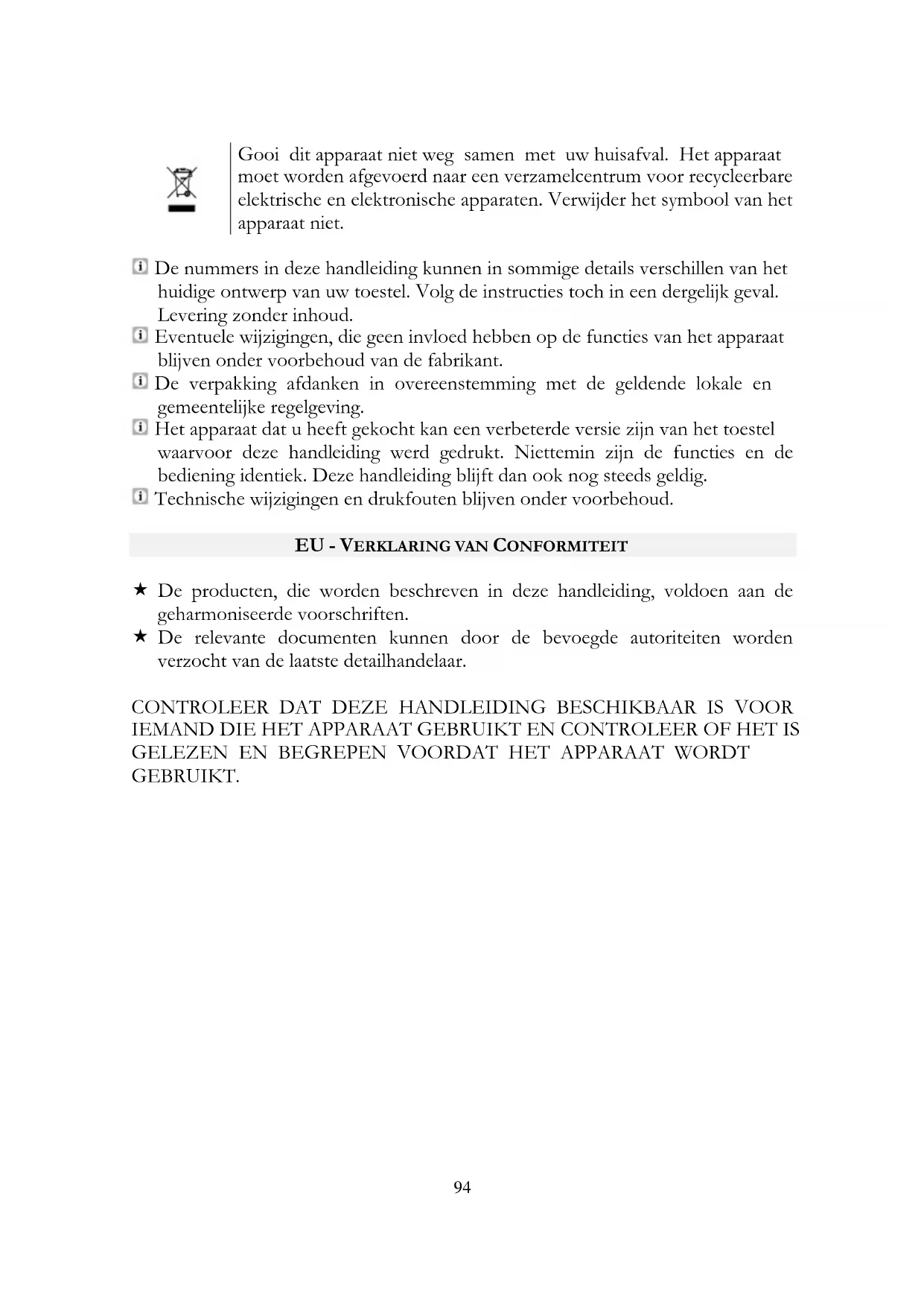 De producten, die worden beschreven in deze handleiding, voldoen aan de geharmoniseerde voorschriften. De relevante documenten kunnen door de bevoegde autoriteiten worden verzocht van de laatste detailhandelaar. CONTROLEER DAT DEZE HANDLEIDING BESCHIKBAAR IS VOOR IEMAND DIE HET APPARAAT GEBRUIKT EN CONTROLEER OF HET IS GELEZEN EN BEGREPEN VOORDAT HET APPARAAT WORDT GEBRUIKT.95