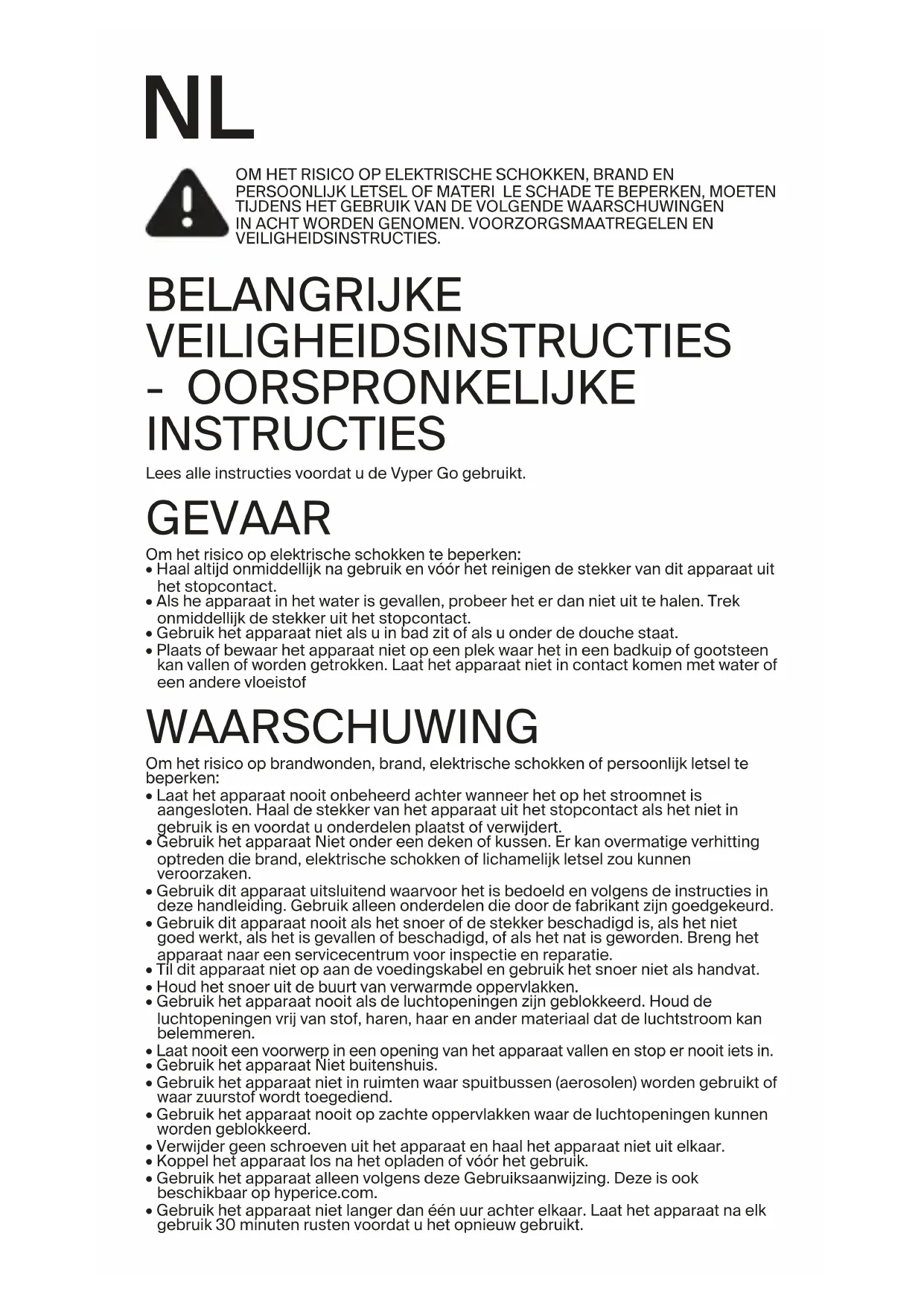 VEILIGHEIDSINSTRUCTIES. BELANGRIJKE VEILIGHEIDSINSTRUCTIES - OORSPRONKELIJKE INSTRUCTIES Lees alle instructies voordat u de Vyper Go gebruikt. GEVAAR Om het risico op elektrische schokken te beperken: