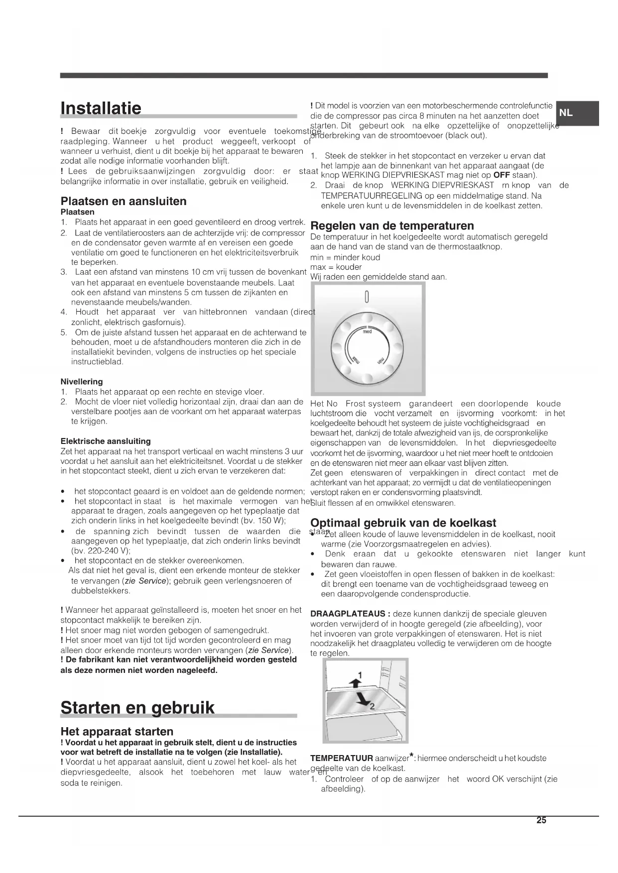 - hetstopcontactendestekkerovereenkomen. Alsdatniethetgevalis,dienteenerkendemonteurdestekker tevervangen(zie Service);gebruikgeenverlengsnoerenof dubbelstekkers. !Wanneerhetapparaatgeïnstalleerdis,moetenhetsnoerenhet stopcontactmakkelijktebereikenzijn. !Hetsnoermagnietwordengebogenofsamengedrukt. !Hetsnoermoetvantijdtottijdwordengecontroleerdenmag alleendoorerkendemonteurswordenvervangen(zie Service). ! De fabrikant kan niet verantwoordelijkheid worden gesteld als deze normen niet worden nageleefd. Starten en gebruik Het apparaat starten ! Voordat u het apparaat in gebruik stelt, dient u de instructies voor wat betreft de installatie na te volgen (zie Installatie). !Voordatuhetapparaataansluit,dientuzowelhetkoel-alshet diepvriesgedeelte, alsook het toebehoren met lauw water en sodatereinigen. !Ditmodelisvoorzienvaneenmotorbeschermendecontrolefunctie diedecompressorpascirca8minutennahetaanzettendoet starten.Dit gebeurtook naelke opzettelijkeof onopzettelijke onderbrekingvandestroomtoevoer(blackout).