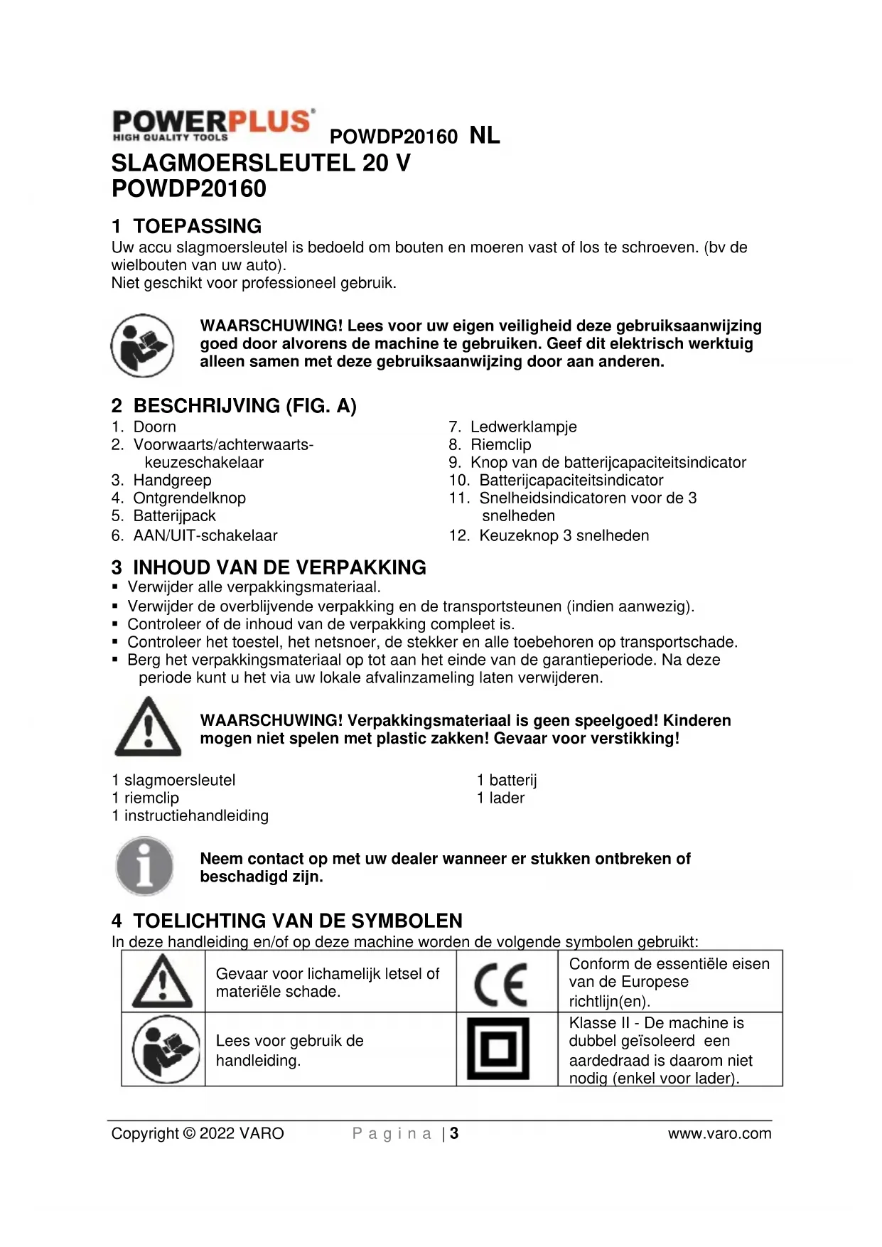 Klasse II - De machine is dubbel geïsoleerd een aardedraad is daarom niet nodig (enkel voor lader).POWDP20160 NL Copyright © 2022 VARO P a g i n a | 4 www.varo.com