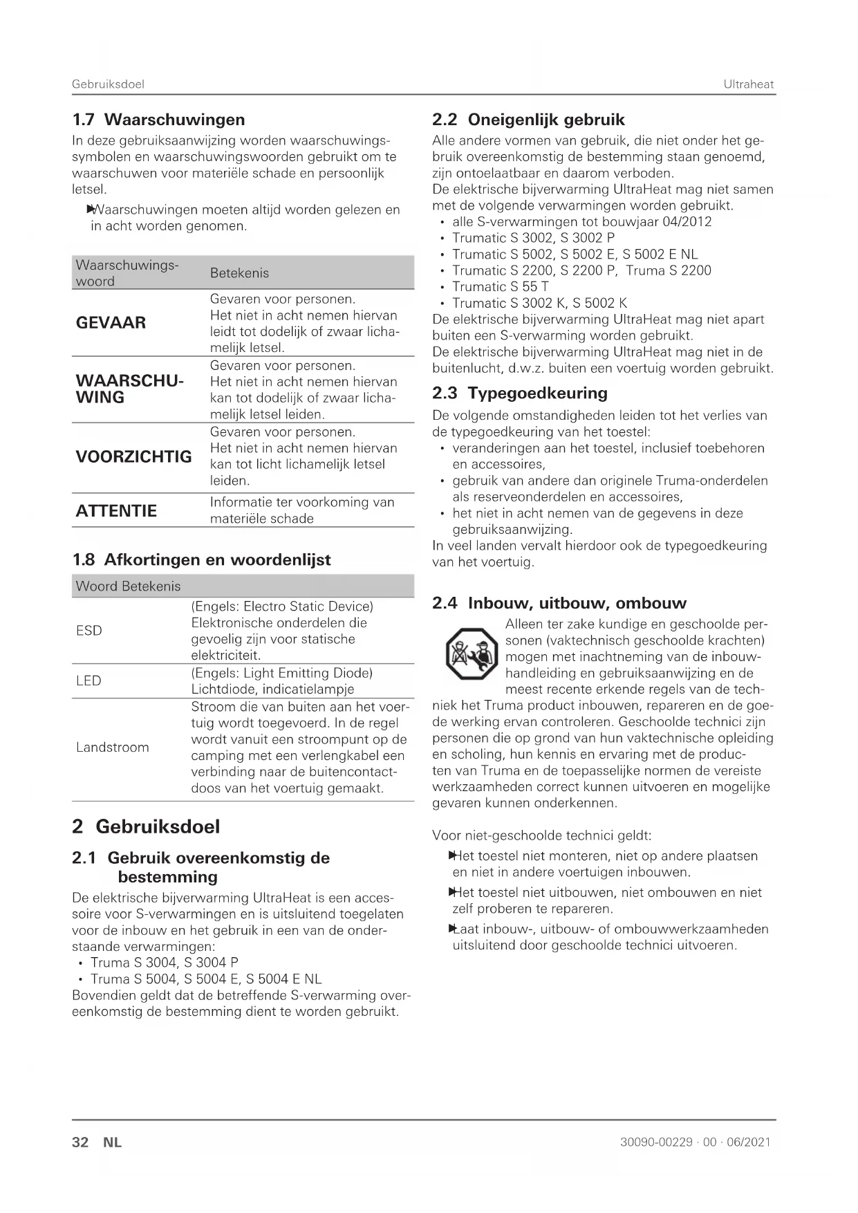 data d’acquisto Il Service Partner autorizzato o il centro di assistenza Truma stabiliranno le ulteriori modalità di procedura Per evitare eventuali danni dovuti al trasporto, l’apparecchio in questione può essere inviato solo previo accordo con il Service Partner autorizzato o il centro di assistenza Truma Se la garanzia viene accettata dal fabbricante, questi si farà carico dei costi di trasporto Qualora il caso non sia coperto dalla garanzia, il consumatore ne sarà informa- to e i costi di riparazione e di trasporto saranno a suo carico Si prega di astenersi dall’effettuare spedizioni prima di aver preso i relativi accordi30090-00229 · 00 · 06/2021 Over deze handleiding Ultraheat 31NL Inhoudsopgave 1 Over deze handleiding 31 11 Documentnummer 31 12 Geldigheid 31 13 Benamingen 31 14 Doelgroep 31 15 Tevens geldende documenten 31 16 Symbolen en weergavemiddelen 31 17 Waarschuwingen 32 18 Afkortingen en woordenlijst 32 2 Gebruiksdoel 32 21 Gebruik overeenkomstig de bestemming 32 22 Oneigenlijk gebruik 32 23 Typegoedkeuring 32 24 Inbouw, uitbouw, ombouw 32 3 Veiligheidsrichtlijnen 33 31 Algemene veiligheid 33 32 Plichten van de gebruiker / houder van het voertuig 33 33 Veilig gebruik 33 34 Hoe te handelen bij storingen 34 4 Productbeschrijving 34 41 Opbouw 34 42 Productidentificatie 34 43 Werking 34 44 Gebruik 34 45 Bedieningspaneel 35 46 Accessoires* 35 5 Ingebruikname 35 6 Bediening 35 61 UltraHeat inschakelen 35 62 UltraHeat uitschakelen 35 7 Storingen 35 8 Reiniging en onderhoud 36 9 Reparatie 36 10 Verwijdering en recycling 36 11 Technische gegevens 36 12 Garantie 36 121 Omvang van de fabrieksgarantie 36 122 Uitsluiting van de garantie 37 123 Claimen van de garantie 37 1 Over deze handleiding Deze handleiding is een onderdeel van het product De bedieningshandleiding moet altijd worden mee- genomen in het voertuig Maak veiligheidsrichtlijnen ook toegankelijk voor an- dere gebruikers