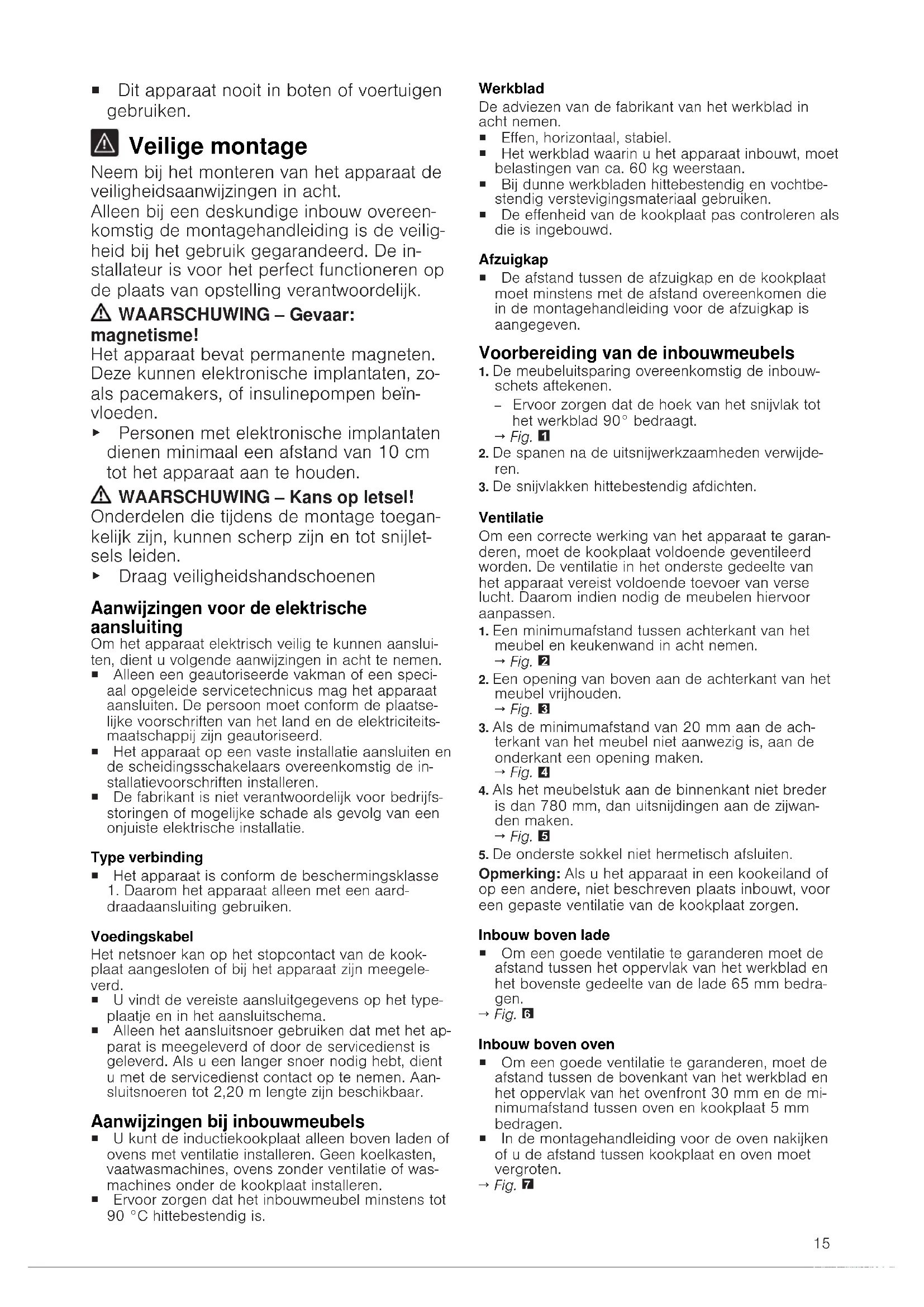 draadaansluiting gebruiken. Voedingskabel Het netsnoer kan op het stopcontact van de kook- plaat aangesloten of bij het apparaat zijn meegele- verd. ¡ U vindt de vereiste aansluitgegevens op het type- plaatje en in het aansluitschema. ¡ Alleen het aansluitsnoer gebruiken dat met het ap- parat is meegeleverd of door de servicedienst is geleverd. Als u een langer snoer nodig hebt, dient u met de servicedienst contact op te nemen. Aan- sluitsnoeren tot 2,20 m lengte zijn beschikbaar. Aanwijzingen bij inbouwmeubels ¡ U kunt de inductiekookplaat alleen boven laden of ovens met ventilatie installeren. Geen koelkasten, vaatwasmachines, ovens zonder ventilatie of was- machines onder de kookplaat installeren. ¡ Ervoor zorgen dat het inbouwmeubel minstens tot 90 °C hittebestendig is. Werkblad De adviezen van de fabrikant van het werkblad in acht nemen. ¡ Effen, horizontaal, stabiel. ¡ Het werkblad waarin u het apparaat inbouwt, moet belastingen van ca. 60 kg weerstaan. ¡ Bij dunne werkbladen hittebestendig en vochtbe- stendig verstevigingsmateriaal gebruiken. ¡ De effenheid van de kookplaat pas controleren als die is ingebouwd. Afzuigkap ¡ De afstand tussen de afzuigkap en de kookplaat moet minstens met de afstand overeenkomen die in de montagehandleiding voor de afzuigkap is aangegeven. Voorbereiding van de inbouwmeubels