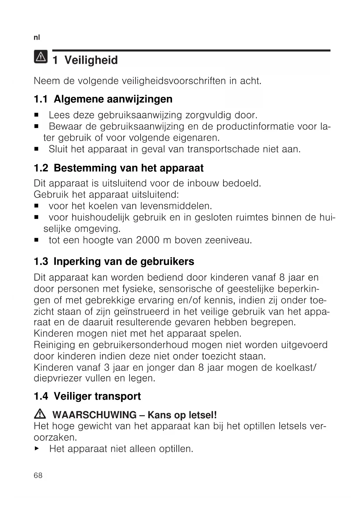1 Veiligheid Neem de volgende veiligheidsvoorschriften in acht. 1.1 Algemene aanwijzingen ¡ Lees deze gebruiksaanwijzing zorgvuldig door. ¡ Bewaar de gebruiksaanwijzing en de productinformatie voor la- ter gebruik of voor volgende eigenaren. ¡ Sluit het apparaat in geval van transportschade niet aan. 1.2 Bestemming van het apparaat Dit apparaat is uitsluitend voor de inbouw bedoeld. Gebruik het apparaat uitsluitend: ¡ voor het koelen van levensmiddelen. ¡ voor huishoudelijk gebruik en in gesloten ruimtes binnen de hui- selijke omgeving. ¡ tot een hoogte van 2000m boven zeeniveau. 1.3 Inperking van de gebruikers Dit apparaat kan worden bediend door kinderen vanaf 8 jaar en door personen met fysieke, sensorische of geestelijke beperkin- gen of met gebrekkige ervaring en/of kennis, indien zij onder toe- zicht staan of zijn geïnstrueerd in het veilige gebruik van het appa- raat en de daaruit resulterende gevaren hebben begrepen. Kinderen mogen niet met het apparaat spelen. Reiniging en gebruikersonderhoud mogen niet worden uitgevoerd door kinderen indien deze niet onder toezicht staan. Kinderen vanaf 3 jaar en jonger dan 8 jaar mogen de koelkast/ diepvriezer vullen en legen. 1.4 Veiliger transport WAARSCHUWING‒Kans op letsel! Het hoge gewicht van het apparaat kan bij het optillen letsels ver- oorzaken. ▶ Het apparaat niet alleen optillen.nl