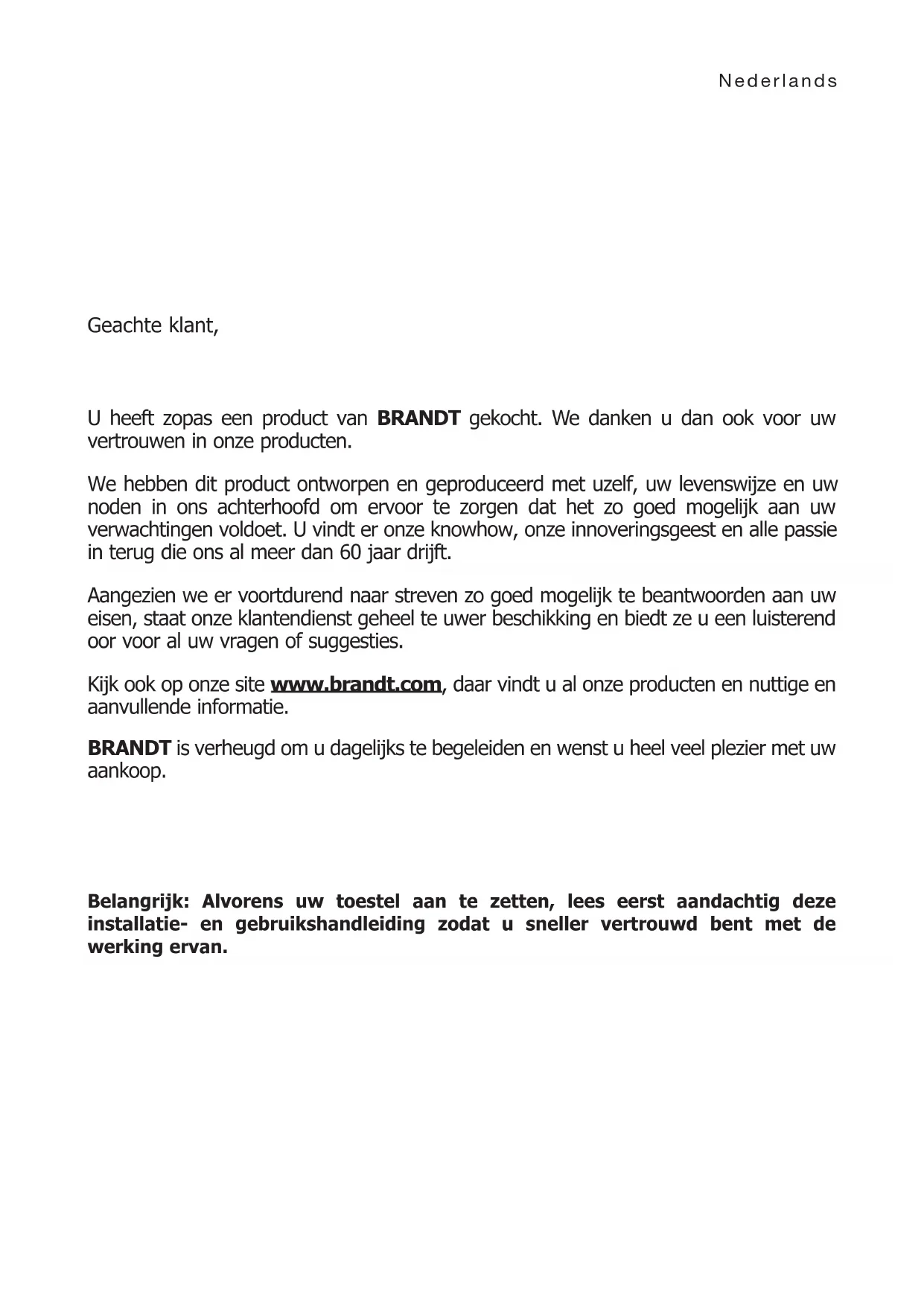 Ochrana životního prostředí Tento spotřebič byl vyvinut a vyroben s maximálním respektem k ochraně životního prostředí. Obal tohoto spotřebiče je vyroben z recyklovatelných materiálů. Jeho odevzdáním k recyklaci do speciálních kontejnerů přispějete k ochraně životního prostředí. Váš spotřebič obsahuje také četné recyklovatelné materiály. Je tedy označen tímto logem, které Vám sděluje, že v zemích Evropské unie se opotřebené přístroje nemají směšovat s jinými odpady. Recyklace přístrojů, kterou zajišťuje výrobce, popř. dodavatel, se provádí za nejlepších podmínek podle evropské směrnice 2012/19/ES o odpadních elektrických a elektronických přístrojích. Kontaktujte orgány místní správy v místě Vašeho bydliště nebo prodejce, u kterého jste spotřebič zakoupili, aby Vám oznámili sběrná místa k odevzdání opotřebených elektrospotřebičů nejblíže Vašemu bydlišti. Děkujeme Vám za spolupráci při ochraně životního prostředí 6Nederlands Geachte klant, U heeft zopas een product van BRANDT gekocht. We danken u dan ook voor uw vertrouwen in onze producten. We hebben dit product ontworpen en geproduceerd met uzelf, uw levenswijze en uw noden in ons achterhoofd om ervoor te zorgen dat het zo goed mogelijk aan uw verwachtingen voldoet. U vindt er onze knowhow, onze innoveringsgeest en alle passie in terug die ons al meer dan 60 jaar drijft. Aangezien we er voortdurend naar streven zo goed mogelijk te beantwoorden aan uw eisen, staat onze klantendienst geheel te uwer beschikking en biedt ze u een luisterend oor voor al uw vragen of suggesties. Kijk ook op onze site www.brandt.com, daar vindt u al onze producten en nuttige en aanvullende informatie. BRANDT is verheugd om u dagelijks te begeleiden en wenst u heel veel plezier met uw aankoop. Belangrijk: Alvorens uw toestel aan te zetten, lees eerst aandachtig deze installatie- en gebruikshandleiding zodat u sneller vertrouwd bent met de werking ervan.Dit apparaat kan gebruikt worden door kinderen van 8 jaar en ouder, en mensen met een verminderde geestelijke of fysieke capaciteiten, of mensen zonder voldoende ervaring en kennis, indien zij worden ingelicht over het gebruik van dit product, en de risico’s hiervan begrijpen. Kinderen mogen niet met het toestel spelen. Schoonmaak en gebruikers- onderhoud mogen niet worden uitgevoerd door kinderen zonder toezicht. Kinderen jonger dan 8 moeten worden weggehouden tenzij ze onder permanent toezicht staan. Het toestel en de bereikbare delen worden zeer heet tijdens het gebruik. Voorzorgen moeten worden genomen om het aanraken van verwarmingselementen te voorkomen. Metalen voorwerpen zoals messen, vorken, lepels en deksels mogen niet op het oppervlak worden geplaatst omdat deze heet kunnen worden. Uw fornuis is voorzien van een kinderbeveiliging voor vergrendeling van de functies tijdens het koken of wanneer de plaat niet aan staat (zie hoofdstuk: gebruik van de kinderbeveiliging). Uw apparaat voldoet aan de Europese richtlijnen en verordeningen volgens dewelke het onderworpen is. Om interferentie tussen uw fornuis en een pacemaker te vermijden, is het belangrijk dat de pacemaker is ontworpen en afgesteld in overeenstemming met de betreffende reglementering. Raadpleeg de fabrikant van de pacemaker of uw behandelend arts. Onbeheerd koken op een kookplaat met vet of olie kan gevaarlijk zijn en kan leiden tot brand. Probeer nooit om een brand met water te blussen, maar schakel het apparaat uit en bedek bijvoorbeeld de vlam met een deksel of blusdeken. WAARSCHUWING: het koken moet worden gecontroleerd. Een korte kookbereiding vereist een continue bewaking. Brandgevaar: geen objecten op het kooktoestel plaatsen. Als het oppervlak gebarsten is, schakel dan het apparaat uit om het risico van een elektrische schok te voorkomen. Gebruik het fornuis niet meer