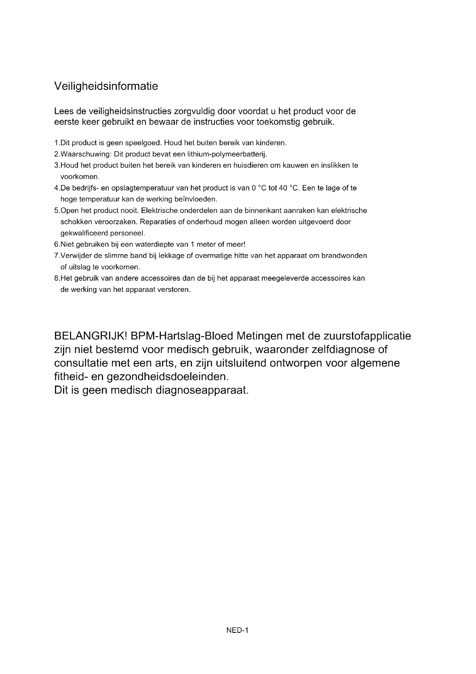 og klik på søgeikonet øverst på hjemmesiden. Skriv DEN-6 Denver denver.eu denver.eumodelnummeret: SW-154.Du kommer nu ind på produktsiden, hvor RED-direktivet kan findes under downloads/andre downloads. Driftsfrekvensområde: 2412-2484 MHZ Maksimal udgangseffekt: 0.555W Omega 5A, Soeften DK-8382 Hinnerup Danmark DEN-7 Denver A/S facebook.com/Denver.eu1.Dit product is geen speelgoed. Houd het buiten bereik van kinderen. 2.Waarschuwing: Dit product bevat een lithium-polymeerbatterij. 3.Houd het product buiten het bereik van kinderen en huisdieren om kauwen en inslikken te voorkomen. 4.De bedrijfs- en opslagtemperatuur van het product is van 0 °C tot 40 °C. Een te lage of te hoge temperatuur kan de werking beïnvloeden. 5.Open het product nooit. Elektrische onderdelen aan de binnenkant aanraken kan elektrische schokken veroorzaken. Reparaties of onderhoud mogen alleen worden uitgevoerd door gekwalificeerd personeel. 6.Niet gebruiken bij een waterdiepte van 1 meter of meer! 7.Verwijder de slimme band bij lekkage of overmatige hitte van het apparaat om brandwonden of uitslag te voorkomen. 8.Het gebruik van andere accessoires dan de bij het apparaat meegeleverde accessoires kan de werking van het apparaat verstoren. Lees de veiligheidsinstructies zorgvuldig door voordat u het product voor de eerste keer gebruikt en bewaar de instructies voor toekomstig gebruik. Veiligheidsinformatie NED-1 BELANGRIJK! BPM-Hartslag-Bloed Metingen met de zuurstofapplicatie zijn niet bestemd voor medisch gebruik, waaronder zelfdiagnose of consultatie met een arts, en zijn uitsluitend ontworpen voor algemene fitheid- en gezondheidsdoeleinden. Dit is geen medisch diagnoseapparaat.1. Compatibel systeem van telefoons en BLE-versie: Android 4.2 en hoger iOS 8.0 en hoger BT4.0