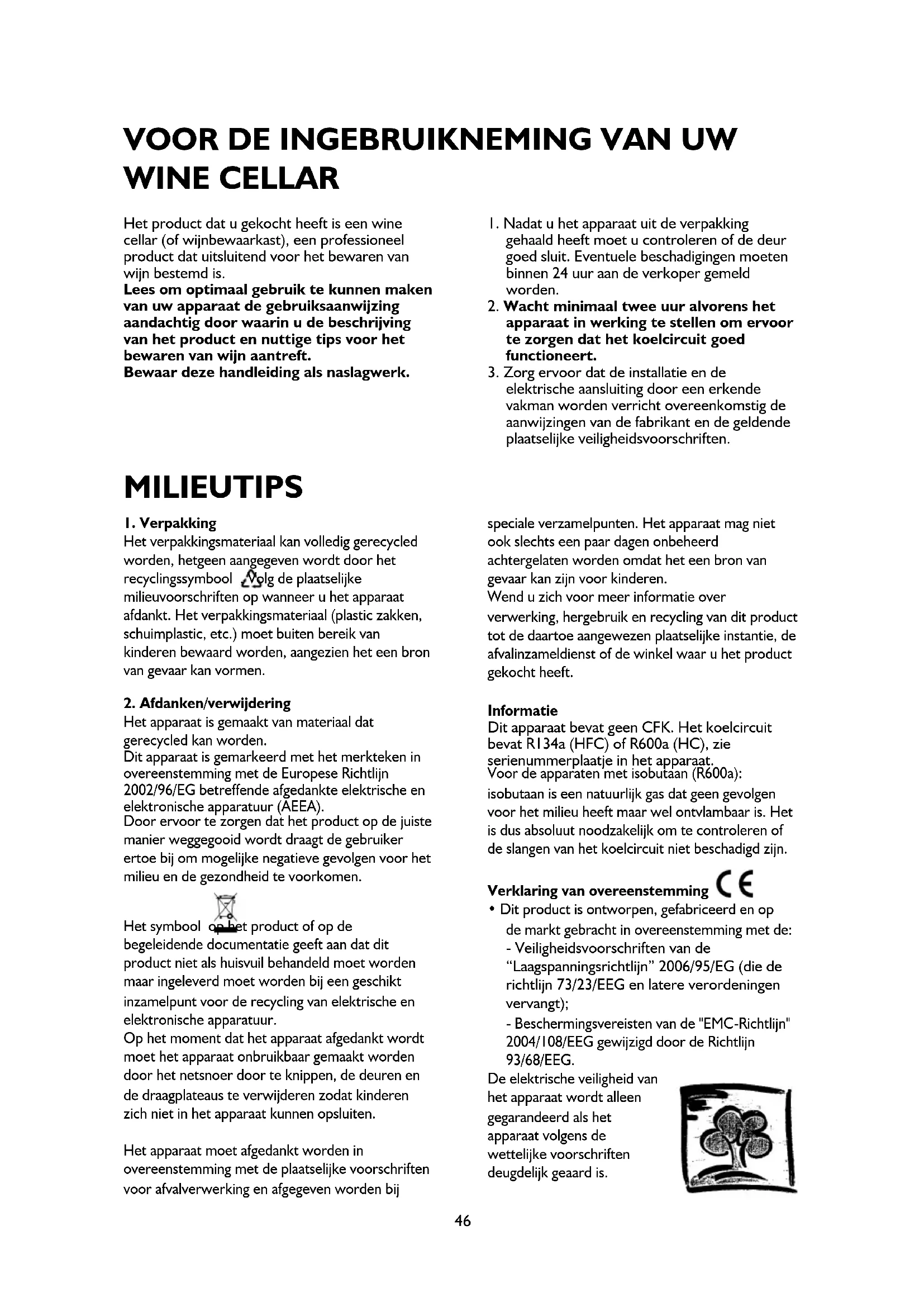 Het apparaat is gemaakt van materiaal dat gerecycled kan worden. Dit apparaat is gemarkeerd met het merkteken in overeenstemming met de Europese Richtlijn 2002/96/EG betreffende afgedankte elektrische en elektronische apparatuur (AEEA). Door ervoor te zorgen dat het product op de juiste manier weggegooid wordt draagt de gebruiker ertoe bij om mogelijke negatieve gevolgen voor het milieu en de gezondheid te voorkomen. Het symbool op het product of op de begeleidende documentatie geeft aan dat dit product niet als huisvuil behandeld moet worden maar ingeleverd moet worden bij een geschikt inzamelpunt voor de recycling van elektrische en elektronische apparatuur. Op het moment dat het apparaat afgedankt wordt moet het apparaat onbruikbaar gemaakt worden door het netsnoer door te knippen, de deuren en de draagplateaus te verwijderen zodat kinderen zich niet in het apparaat kunnen opsluiten. Het apparaat moet afgedankt worden in overeenstemming met de plaatselijke voorschriften voor afvalverwerking en afgegeven worden bij speciale verzamelpunten. Het apparaat mag niet ook slechts een paar dagen onbeheerd achtergelaten worden omdat het een bron van gevaar kan zijn voor kinderen. Wend u zich voor meer informatie over verwerking, hergebruik en recycling van dit product tot de daartoe aangewezen plaatselijke instantie, de afvalinzameldienst of de winkel waar u het product gekocht heeft. Informatie Dit apparaat bevat geen CFK. Het koelcircuit bevat R134a (HFC) of R600a (HC), zie serienummerplaatje in het apparaat. Voor de apparaten met isobutaan (R600a): isobutaan is een natuurlijk gas dat geen gevolgen voor het milieu heeft maar wel ontvlambaar is. Het is dus absoluut noodzakelijk om te controleren of de slangen van het koelcircuit niet beschadigd zijn. Verklaring van overeenstemming