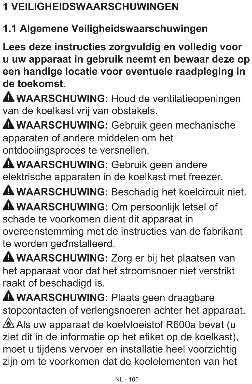 Lees deze instructies zorgvuldig en volledig voor u uw apparaat in gebruik neemt en bewaar deze op een handige locatie voor eventuele raadpleging in de toekomst. WAARSCHUWING: Houd de ventilatieopeningen van de koelkast vrij van obstakels. WAARSCHUWING: Gebruik geen mechanische apparaten of andere middelen om het ontdooiingsproces te versnellen. WAARSCHUWING: Gebruik geen andere elektrische apparaten in de koelkast met freezer. WAARSCHUWING: Beschadig het koelcircuit niet. WAARSCHUWING: Om persoonlijk letsel of schade te voorkomen dient dit apparaat in overeenstemming met de instructies van de fabrikant te worden geďnstalleerd. WAARSCHUWING: Zorg er bij het plaatsen van het apparaat voor dat het stroomsnoer niet verstrikt raakt of beschadigd is. WAARSCHUWING: Plaats geen draagbare stopcontacten of verlengsnoeren achter het apparaat. Als uw apparaat de koelvloeistof R600a bevat (u ziet dit in de informatie op het etiket op de koelkast), moet u tijdens vervoer en installatie heel voorzichtig zijn om te voorkomen dat de koelelementen van hetNL - 101 apparaat beschadigen. R600a is wel een milieuvriendelijk en natuurlijk gas. Maar omdat het explosief is, moet u de ruimte waar het apparaat wordt geplaatst een paar minuten ventileren en open vuur weg houden, voor het geval dat door beschadiging van de koelelementen gas lekt.