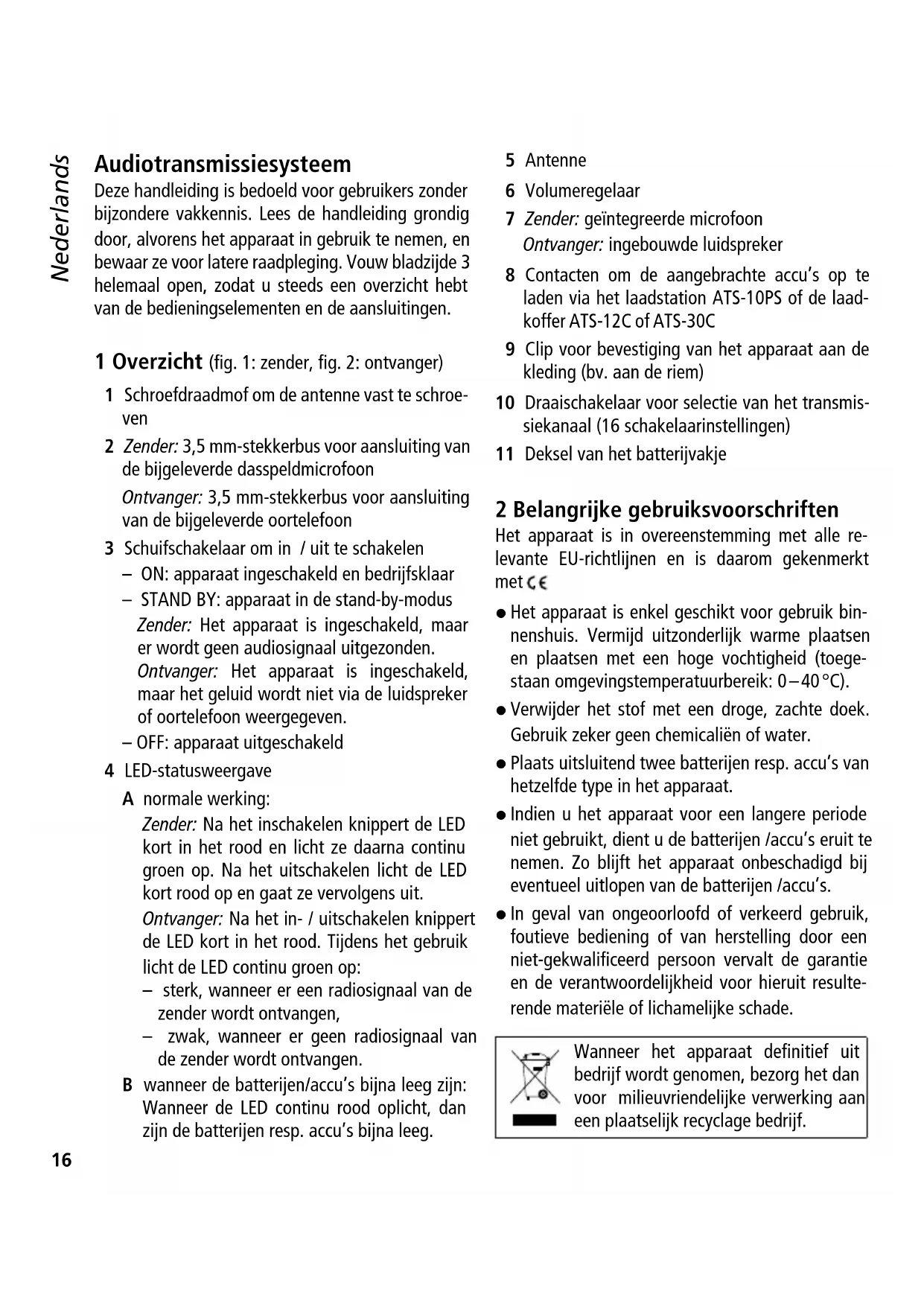 INTERNATIONAL GmbH & Co. KG si ri- serva ogni diritto di elaborazione in qualsiasi forma del- le presenti istruzioni per l’uso. La riproduzione – anche parziale – per propri scopi commerciali è vietata.16 Nederlands Deutsch Deutsch Seite Inhalt English English Page Contents Français Français Page Table des matières Italiano Italiano Pagina Indice Español Español Página Contenidos Polski Polski Strona Spis treści Magyar Magyar Page Audiotransmissiesysteem Deze handleiding is bedoeld voor gebruikers zonder bijzondere vakkennis. Lees de handleiding grondig door, alvorens het apparaat in gebruik te nemen, en bewaar ze voor latere raadpleging. Vouw bladzijde3 helemaal open, zodat u steeds een overzicht hebt van de bedieningselementen en de aansluitingen. 1 Overzicht (fig. 1: zender, fig. 2: ontvanger) 1 Schroefdraadmof om de antenne vast te schroe- ven 2 Zender: 3,5 mm-stekkerbus voor aansluiting van de bijgeleverde dasspeldmicrofoon Ontvanger: 3,5 mm-stekkerbus voor aansluiting van de bijgeleverde oortelefoon 3 Schuifschakelaar om in / uit te schakelen – ON: apparaat ingeschakeld en bedrijfsklaar – STAND BY: apparaat in de stand-by-modus Zender: Het apparaat is ingeschakeld, maar er wordt geen audiosignaal uitgezonden. Ontvanger: Het apparaat is ingeschakeld, maar het geluid wordt niet via de luidspreker of oortelefoon weergegeven. – OFF: apparaat uitgeschakeld 4 LED-statusweergave A normale werking: Zender: Na het inschakelen knippert de LED kort in het rood en licht ze daarna continu groen op. Na het uitschakelen licht de LED kort rood op en gaat ze vervolgens uit. Ontvanger: Na het in- / uitschakelen knippert de LED kort in het rood. Tijdens het gebruik licht de LED continu groen op: – sterk, wanneer er een radiosignaal van de zender wordt ontvangen, – zwak, wanneer er geen radiosignaal van de zender wordt ontvangen. B wanneer de batterijen /accu’s bijna leeg zijn: Wanneer de LED continu rood oplicht, dan zijn de batterijen resp. accu’s bijna leeg. 5 Antenne 6 Volumeregelaar 7 Zender: geïntegreerde microfoon Ontvanger: ingebouwde luidspreker 8 Contacten om de aangebrachte accu’s op te laden via het laadstation ATS-10PS of de laad- koffer ATS-12C of ATS-30C 9 Clip voor bevestiging van het apparaat aan de kleding (bv. aan de riem) 10 Draaischakelaar voor selectie van het transmis- siekanaal (16 schakelaarinstellingen) 11 Deksel van het batterijvakje 2 Belangrijke gebruiksvoorschriften Het apparaat is in overeenstemming met alle re- levante EU-richtlijnen en is daarom gekenmerkt met .