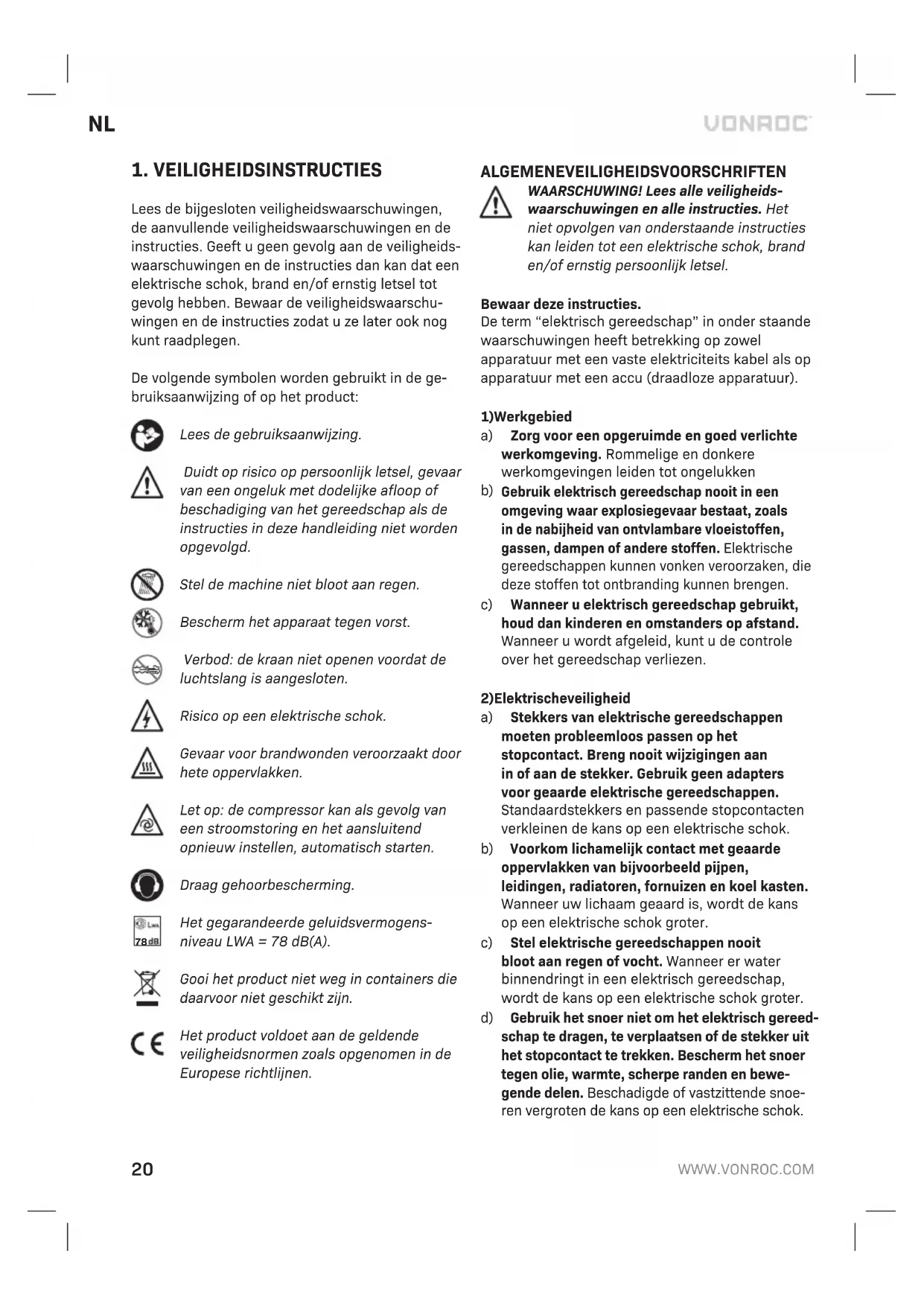 - Of stroomtoevoer aanwezig is (of de stekker op de juiste manier is ingestoken, de thermische zekering niet defect is). De compressor schakelt niet uit Als de compressor niet uitschakelt als de maximale druk is bereikt, zal de veiligheidsklep van de tank activeren. Het is noodzakelijk om voor reparatie contact op te nemen met het meest dichtstbijzijnde erkende servicecentrum. MILIEU Niet goed functionerende en/of afgedankte elektrische of elektronische apparaten moeten bij de juiste inzamelpunten voor recycling worden aangeboden. Uitsluitend voor EU-landen Werp elektrisch gereedschap niet weg bij het huisvuil. Conform de Europese Richtlijn 2012/19/ EU voor Afgedankte Elektrische en Elektronische Apparatuur en de implementatie ervan in nationaal recht moet niet langer te gebruiken elektrisch gereedschap gescheiden worden verzameld en op een milieuvriendelijke wijze worden verwerkt. GARANTIE Producten van VONROC worden op basis van de hoogste kwaliteitsnormen ontwikkeld en zijn gega- randeerd vrij van defecten, zowel voor wat betreft het materiaal als de afwerking, gedurende de door de wet bepaalde periode, startend vanaf de datum van de originele aankoop. Mocht het product gedurende deze periode enige storingen vertonen als gevolg van gebrekkig materiaal en/of gebrek- kige afwerking, dient direct contact met VONROC opgenomen te worden. De volgende omstandigheden zijn uitgesloten van de garantie: