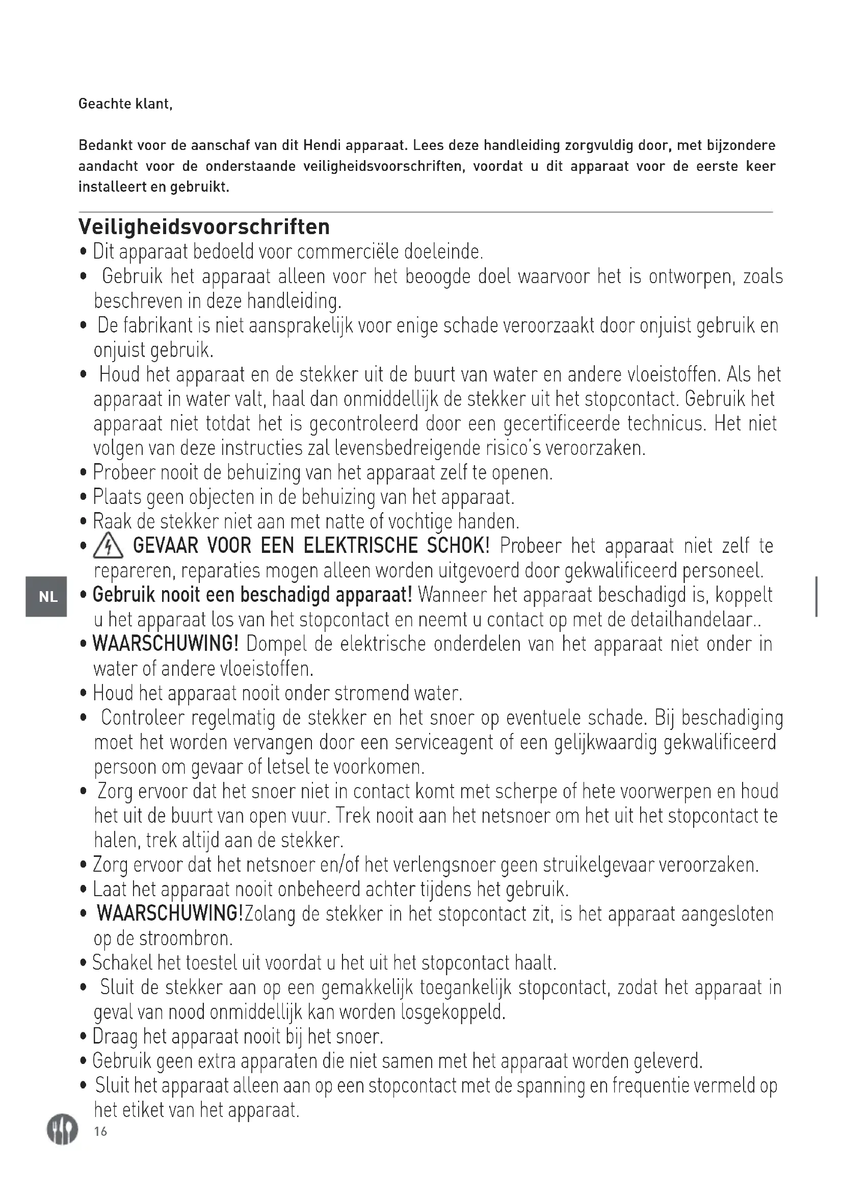 Geachte klant, Bedankt voor de aanschaf van dit Hendi apparaat. Lees deze handleiding zorgvuldig door, met bijzondere aandacht voor de onderstaande veiligheidsvoorschriften, voordat u dit apparaat voor de eerste keer installeert en gebruikt. Veiligheidsvoorschriften