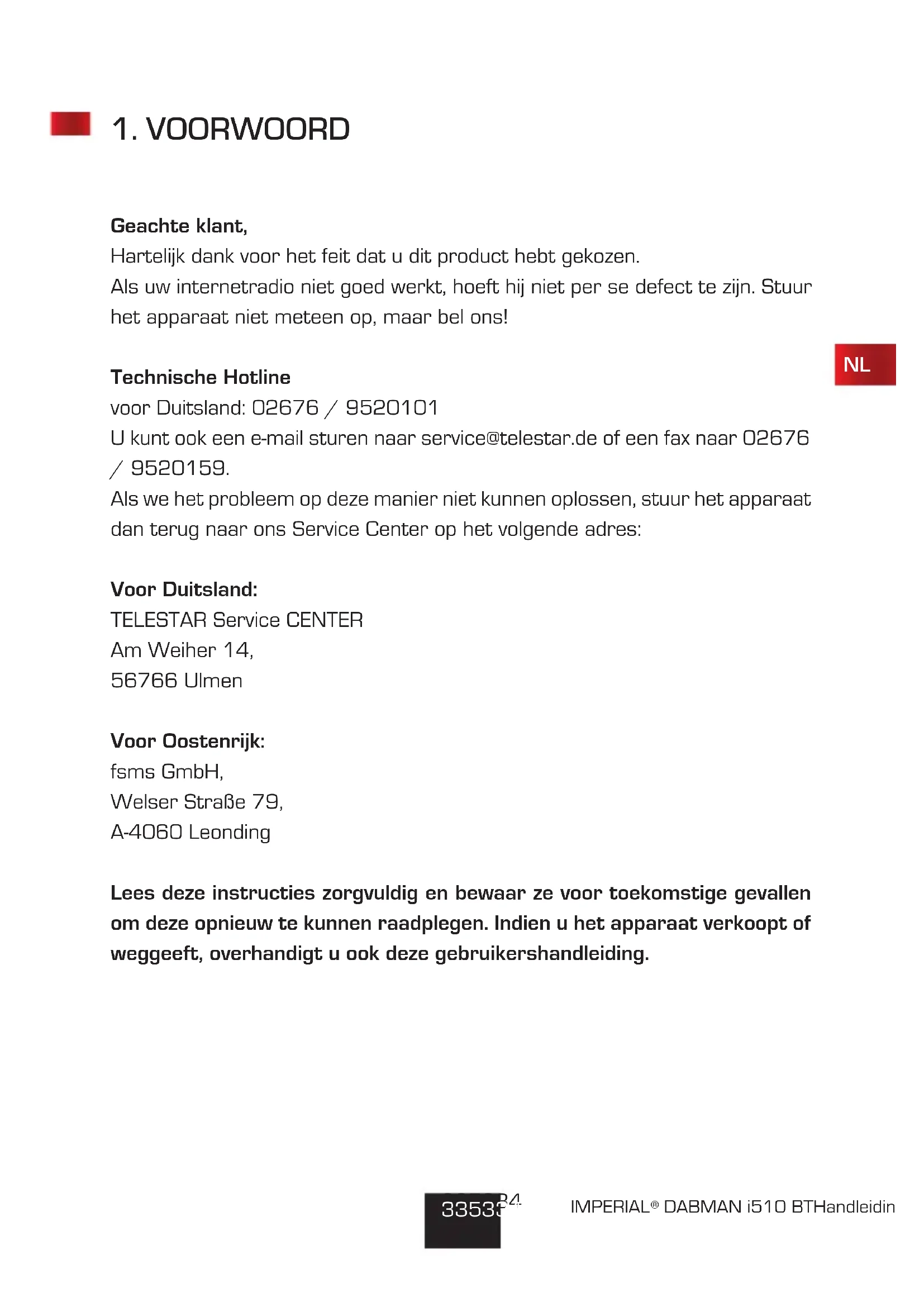 Geachte klant, Hartelijk dank voor het feit dat u dit product hebt gekozen. Als uw internetradio niet goed werkt, hoeft hij niet per se defect te zijn. Stuur het apparaat niet meteen op, maar bel ons! Technische Hotline voor Duitsland: 02676 / 9520101 U kunt ook een e-mail sturen naar service@telestar.de of een fax naar 02676 / 9520159. Als we het probleem op deze manier niet kunnen oplossen, stuur het apparaat dan terug naar ons Service Center op het volgende adres: Voor Duitsland: TELESTAR Service CENTER Am Weiher 14, 56766 Ulmen Voor Oostenrijk: fsms GmbH, Welser Straße 79, A-4060 Leonding Lees deze instructies zorgvuldig en bewaar ze voor toekomstige gevallen om deze opnieuw te kunnen raadplegen. Indien u het apparaat verkoopt of weggeeft, overhandigt u ook deze gebruikershandleiding.