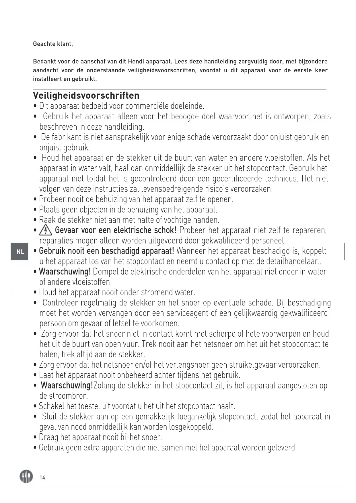 Geachte klant, Bedankt voor de aanschaf van dit Hendi apparaat. Lees deze handleiding zorgvuldig door, met bijzondere aandacht voor de onderstaande veiligheidsvoorschriften, voordat u dit apparaat voor de eerste keer installeert en gebruikt. Veiligheidsvoorschriften