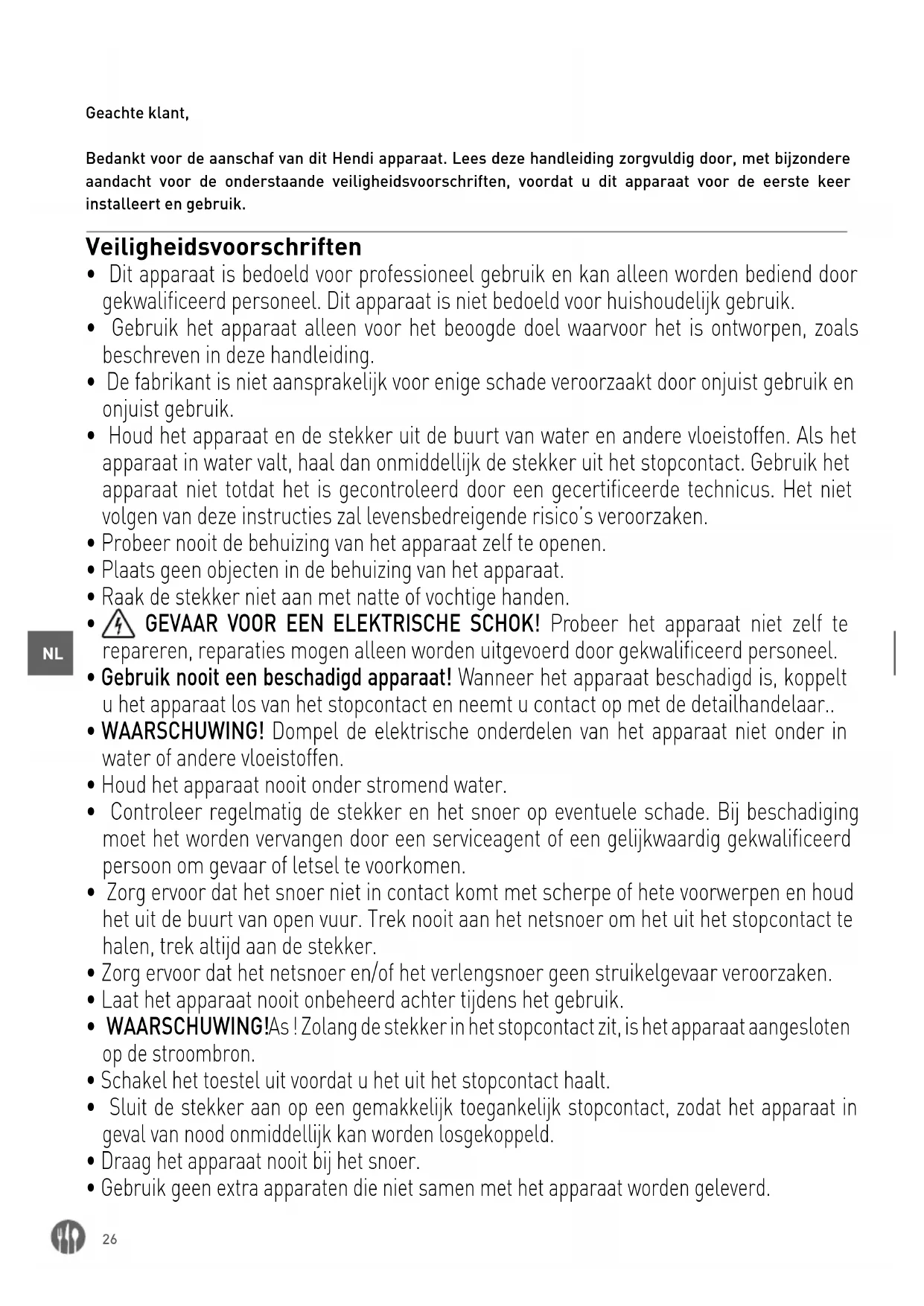 Geachte klant, Bedankt voor de aanschaf van dit Hendi apparaat. Lees deze handleiding zorgvuldig door, met bijzondere aandacht voor de onderstaande veiligheidsvoorschriften, voordat u dit apparaat voor de eerste keer installeert en gebruik. Veiligheidsvoorschriften