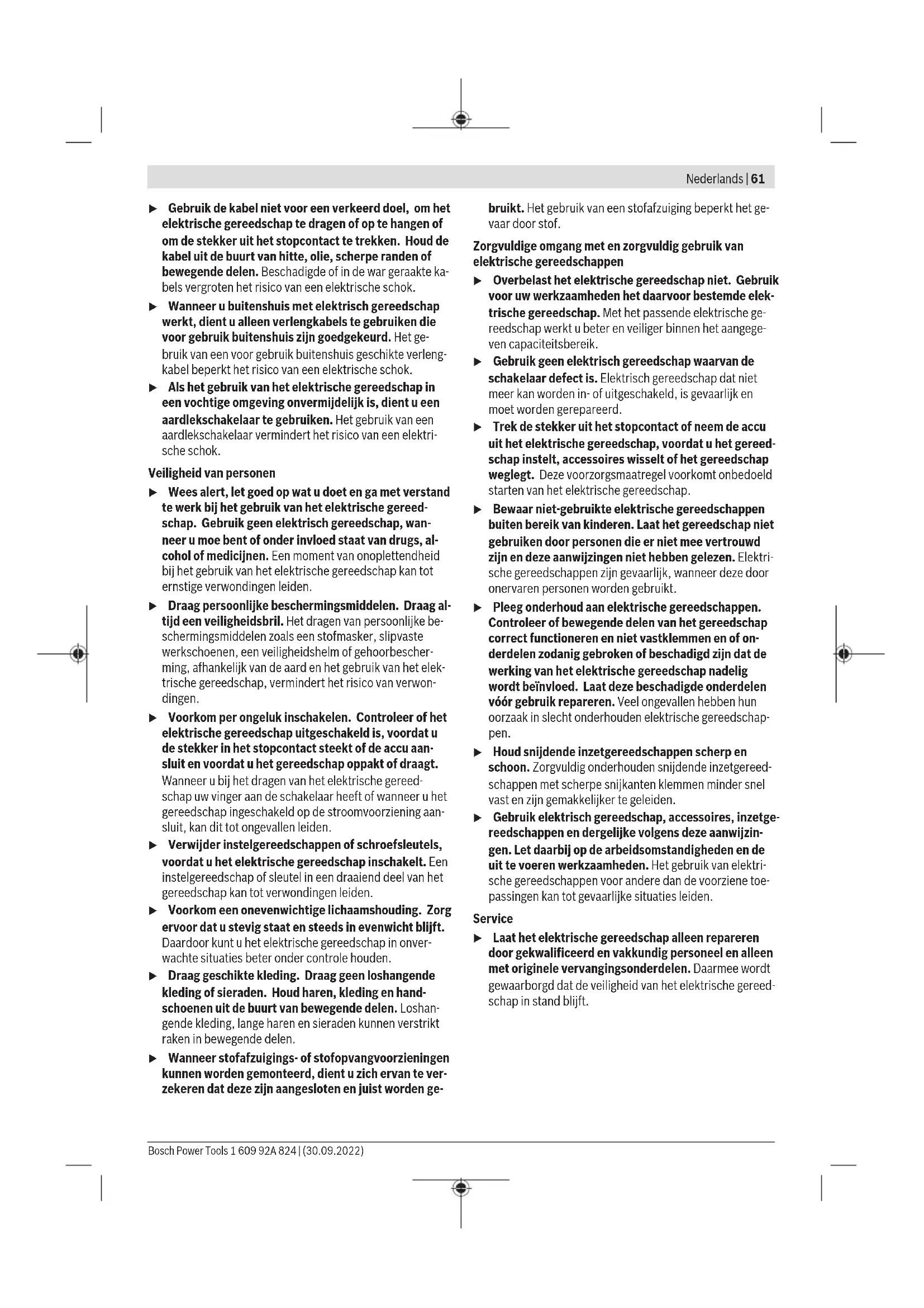 Het in deze gebruiksaanwijzing vermelde trillingsniveau is gemeten met een volgens ENgenormeerde meetmethode en kan worden gebruikt om elektrische gereedschappen met el- kaar te vergelijken. Het is ook geschikt voor een voorlopige inschatting van de trillingsbelasting. Het aangegeven trillingsniveau representeert de voornaams- te toepassingen van het elektrische gereedschap. Als echter het elektrische gereedschap wordt gebruikt voor andere toe- passingen, met afwijkende inzetgereedschappen of onvol- doende onderhoud, kan het trillingsniveau afwijken. Dit kan de trillingsbelasting gedurende de gehele arbeidsperiode duidelijk verhogen. Voor een nauwkeurige schatting van de trillingsbelasting moet ook rekening worden gehouden met de tijd waarin het gereedschap uitgeschakeld is, of waarin het gereedschap wel loopt, maar niet werkelijk wordt gebruikt. Dit kan de tril- lingsbelasting gedurende de gehele arbeidsperiode duidelijk verminderen. Leg aanvullende veiligheidsmaatregelen ter bescherming van de gebruiker tegen het effect van trillingen vast, zoals: onderhoud van elektrische gereedschappen en inzetgereed- schappen, warm houden van de handen, organisatie van het arbeidsproces. Bosch Power Tools 1 609 92A 824 | (30.09.2022)66 | Nederlands Montage Veiligheidsvoorziening monteren u Trek vóór werkzaamheden aan het elektrische gereed- schap altijd de stekker uit het stopcontact. Aanwijzing: Na breuk van de slijpschijf tijdens het gebruik of bij beschadiging van de opnamevoorzieningen bij de be- schermkap/het elektrische gereedschap moet het elektri- sche gereedschap zo spoedig mogelijk naar de klantenservi- ce worden opgestuurd. Zie voor adressen het gedeelte „Klantenservice en gebruiksadvies“. Beschermkap voor slijpen Zet de beschermkap (6) op de ashals. Pas de positie van de beschermkap (6) aan de eisen van de bewerking aan en ver- grendel de beschermkap (6) met de vastzetschroef (7). u Stel de beschermkap (6) zodanig in dat er geen von- ken in de richting van de gebruiker vliegen. Beschermkap voor doorslijpen u Gebruik bij het doorslijpen met gebonden slijpmidde- len altijd de beschermkap voor doorslijpen (14). u Zorg bij het doorslijpen van steen voor voldoende stofafzuiging. De beschermkap voor doorslijpen (14) wordt net als de be- schermkap voor slijpen (6) gemonteerd. Stofafzuigkap voor doorslijpen met geleidebeugels Neem voor de montage van de afzuigkap voor doorslijpen met geleidebeugels(23) goed nota van de gebruiksaanwij- zing van de afzuigkap. Extra handgreep u Gebruik uw elektrische gereedschap alleen met de ex- tra handgreep (3). Schroef de extra handgreep (3) afhankelijk van de werkwijze rechts of links van de machinekop vast. Handbescherming u Monteer voor werken met het rubber schuurplateau (18) of met de komstaalborstel/vlakstaalborstel/la- mellenschuurschijf altijd de handbescherming (16). Bevestig de handbescherming (16) met de extra handgreep (3). Slijpgereedschap monteren u Trek vóór werkzaamheden aan het elektrische gereed- schap altijd de stekker uit het stopcontact. u Raak de (door)slijpschijven niet aan, voordat ze afge- koeld zijn. De schijven worden bij het werken erg heet. Reinig de slijpas (5) en alle te monteren delen. Druk voor het vastspannen en losmaken van de slijpgereed- schappen op de asblokkeerknop (1) om de slijpas vast te zetten. u Bedien de asblokkeerknop alleen, als de slijpas stil- staat. Anders kan het elektrische gereedschap bescha- digd raken. (Door)slijpschijf Let op de afmetingen van de slijpaccessoires. De gatdiame- ter moet bij de opnameflens passen. Gebruik geen adapters of reduceerstukken. Let er bij het gebruik van diamantdoorslijpschijven op dat de draairichtingpijl op de diamantdoorslijpschijf en de draai- richting van het elektrische gereedschap (zie draairichting- pijl op de machinekop) overeenstemmen. De volgorde van de montage is te zien op de pagina met af- beeldingen. Voor het bevestigen van de (door)slijpschijf schroeft u de spanmoer(10) erop en spant u deze met de pensleutel (zie „Snelspanmoer “, Pagina66). u Controleer na de montage van het slijpgereedschap en vóór het inschakelen of het slijpgereedschap cor- rect is gemonteerd en vrij kan draaien. Controleer of het slijpgereedschap de beschermkap of andere delen niet raakt. In de opnameflens (8) is om de centreerkraag een kunststof deel (O-ring) geplaatst. Als de O-ring ontbreekt of beschadigd is, dan moet de opnameflens (8) vóór het verdere gebruik absoluut vervangen worden. Lamellenschuurschijf u Monteer voor het werken met de lamellenschuurschijf altijd de handbescherming (16). Rubber schuurplateau u Monteer voor het werken met het rubber schuurpla- teau (18) altijd de handbescherming (16). De volgorde van de montage is te zien op de pagina met af- beeldingen. Plaats vóór de montage van het rubber schuurplateau (18) de 2 vulringen (17) op de slijpas (5). Schroef de ronde moer(20) erop en span deze met de pen- sleutel. Komstaalborstel/vlakstaalborstel u Monteer voor het werken met de komstaalborstel of vlakstaalborstel altijd de handbescherming (16). De volgorde van de montage is te zien op de pagina met af- beeldingen. De komstaalborstel/vlakstaalborstel moet zover op de slijpas kunnen worden geschroefd dat deze op de slijpasflens hele- maal tegen het einde van de slijpasdraad ligt. Span de kom- staalborstel/vlakstaalborstel met een steeksleutel vast. Snelspanmoer Voor eenvoudig wisselen van slijpgereedschappen zonder het gebruik van andere gereedschappen kunt u in plaats van de spanmoer (10) de snelspanmoer (12) gebruiken. u De snelspanmoer(12) mag alleen voor (door)slijp- schijven of schijfborstels met een gatdiameter van 22,2 mm worden gebruikt. Gebruik uitsluitend een onberispelijke, onbeschadigde snelspanmoer (12). 1 609 92A 824 | (30.09.2022) Bosch Power ToolsNederlands | 67 Let er bij het erop schroeven op dat de beschreven kant van de snelspanmoer (12) niet naar de slijpschijf wijst; de pijl moet naar de indexmarkering (24) wijzen. (24) Druk op de asb
