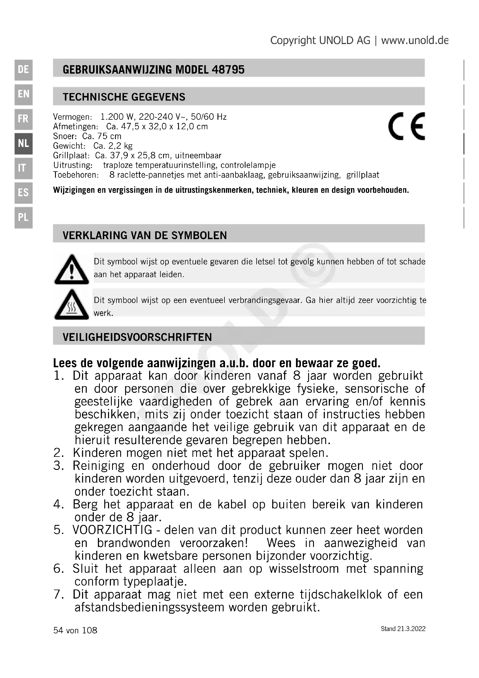 Vermogen: 1.200 W, 220-240 V~, 50/60 Hz Afmetingen: Ca. 47,5 x 32,0 x 12,0 cm Snoer: Ca. 75 cm Gewicht: Ca. 2,2 kg Grillplaat: Ca. 37,9 x 25,8 cm, uitneembaar Uitrusting: traploze temperatuurinstelling, controlelampje Toebehoren: 8 raclette-pannetjes met anti-aanbaklaag, gebruiksaanwijzing, grillplaat Wijzigingen en vergissingen in de uitrustingskenmerken, techniek, kleuren en design voorbehouden. GEBRUIKSAANWIJZING MODEL 48795 VEILIGHEIDSVOORSCHRIFTEN TECHNISCHE GEGEVENS Lees de volgende aanwijzingen a.u.b. door en bewaar ze goed.