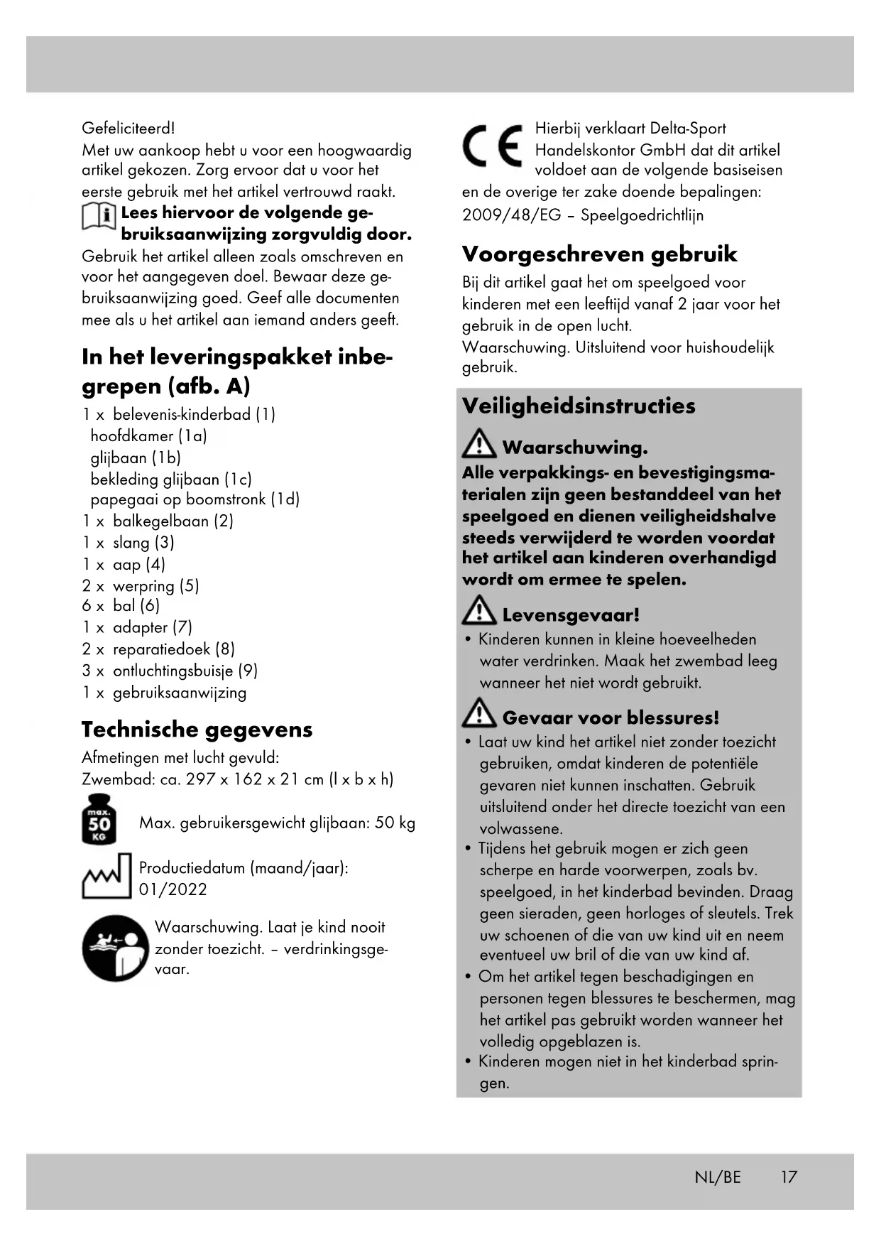 op het beschadigde oppervlak en druk de doek stevig aan. Opslag, reiniging Ververs het water in het artikel vaak, in het bij- zonder bij warm weer en wanneer het vervuild is! Berg het artikel bij niet-gebruik altijd niet opgepompt, droog en schoon bij kamertempera- tuur op. De ventielen dienen bij de opslag steeds gesloten te zijn. Uitsluitend met water of zeepwa- ter en nooit met chemische onderhoudsproduc- ten reinigen. Bij de opslag tijdens de winter geen scherpe voorwerpen op het artikel zetten en niet met talkpoeder bestrooien. Afvalverwerking Voer het artikel en verpakkingsmaterialen in overeenstemming met actuele lokale voor- schriften af. Verpakkingsmaterialen, zoals bv. foliezakjes, horen niet thuis in kinderhanden. Berg het verpakkingsmateriaal buiten het bereik van kinderen op. Voer de producten en verpakkingen op milieuvriendelijke wijze af. De recyclingcode dient om verschillende materialen te kenmerken ten behoeve van hergebruik via het recyclingproces. De code bestaat uit het recyclingsymbool, dat het recyclingproces weerspiegelt, en een getal dat het materiaal identificeert. Opmerkingen over garantie en serviceafhandeling Het artikel werd met de grootste zorgvuldigheid en onder permanent toezicht geproduceerd. De firma DELTA-SPORT HANDELSKONTOR GmbH verleent particuliere eindklanten op dit artikel drie jaar garantie, te rekenen vanaf de datum van aankoop (garantietermijn) en dit op grond van de volgende bepalingen. De garantie geldt alleen voor materiaal- en verwerkingsfouten. De garantie is niet van toepassing op onderde- len die aan een normale slijtage onderhevig zijn en daarom als niet-slijtvaste onderdelen te beschouwen zijn (bv. batterijen) en evenmin op breekbare onderdelen, bv. schakelaars, accu’s of onderdelen die van glas gemaakt zijn. Uit de garantie voortvloeiende claims zijn uitge- sloten als het artikel onvakkundig, verkeerd of niet in het kader van de voorziene bepaling of in het kader van het voorziene gebruiksdoeleinde gebruikt werd of indien richtlijnen in de gebruiks- aanwijzing niet in acht genomen werden, tenzij de eindklant aantoont dat er sprake is van een materiaal- of verwerkingsfout die niet op één van de hoger vermelde omstandigheden gebaseerd is. Uit de garantie voortvloeiende claims kunnen alleen tijdens de garantieperiode op vertoon van de originele kassabon ingediend wor- den. Gelieve daarom de originele kassabon te bewaren. De garantieperiode wordt door eventuele reparaties op grond van de garantie, wettelijke waarborg of coulance niet verlengd. Dit geldt ook voor vervangen en gerepareerde onderdelen. Gelieve u bij klachten in eerste instantie tot de hieronder vermelde servicehotline te richten of met ons per e-mail contact op te nemen. Is er sprake van een garantiegeval, dan wordt het ar- tikel door ons – naar onze keuze – voor u gratis gerepareerd, wordt het vervangen of wordt de aankoopsom terugbetaald. Verdere rechten op grond van de garantie bestaan niet. Uw wettelijke rechten, in het bijzonder rechten op garantie tegenover de betreffende verkoper, worden door deze garantie niet beperkt. IAN: 385205_2107 Service België Tel.: 070 270 171 (0,15 EUR/Min.) E-Mail: deltasport@lidl.be Service Nederland Tel.: 0900 0400223 (0,10 EUR/Min.) E-Mail: deltasport@lidl.nl21 Gratulujemy! Decydując się na ten produkt, otrzymują Pań- stwo towar wysokiej jakości. Należy zapoznać się z produktem przed jego pierwszym użyciem. Należy uważnie przeczytać następującą instrukcję użytkowa- nia. Produkt ten należy użytkować wyłącznie w opisany sposób oraz zgodnie ze wskazanym przeznaczeniem. Niniejszą instrukcję użytko- wania należy przechowywać w bezpiecznym miejscu. Przekazując produkt innej osobie, należy upewnić się, że otrzyma ona także całą dokumentację dotyczącą produktu. Zakres dostawy (rys. A) 1 x basen wrażeń (1) komora główna (1a) zjeżdżalnia (1b) tapicerka zjeżdżalni (1c) papuga na pniu drzewa (1d) 1 x zjeżdżalnia na kulki (2) 1 x wężownica (3) 1 x małpa (4) 2 x ringo (5) 6 x piłka (6) 1 x adapter (7) 2 x łatka naprawcza (8) 3 x rurka do spuszczania powietrza (9) 1 x instrukcja użytkowania Dane techniczne Wymiary po napełnieniu powietrzem: niecka basenu: ok. 297 x 162 x 21 cm (dł. x szer. x wys.) Maks. masa użytkownika zjeżdżalni: 50 kg Data produkcji (miesiąc/rok): 01/2022 Ostrzeżenie. Nigdy nie zostawiaj swojego dziecka bez nadzoru - nie- bezpieczeństwo utonięcia. Firma Delta-Sport Handelskontor GmbH oświadcza, że niniejszy produkt spełnia najważniejsze wymagania oraz jest zgodny z podanymi poniżej wytycznymi: 2009/48/WE – dyrektywa w sprawie bezpie- czeństwa zabawek Zastosowanie zgodne z prze- znaczeniem Niniejszy artykuł jest zabawką dla dzieci w wieku powyżej 2 lat do użytku na wolnym powietrzu. Ostrzeżenie. Wyłącznie do użytku domowego. Wskazówki bezpieczeństwa Ostrzeżenie. Wszelkie materiały opakowaniowe i montażowe nie są częścią zabawki i ze względów bezpieczeństwa należy je zawsze usunąć przed przekazaniem produktu dzieciom do zabawy. Zagrożenie dla życia!