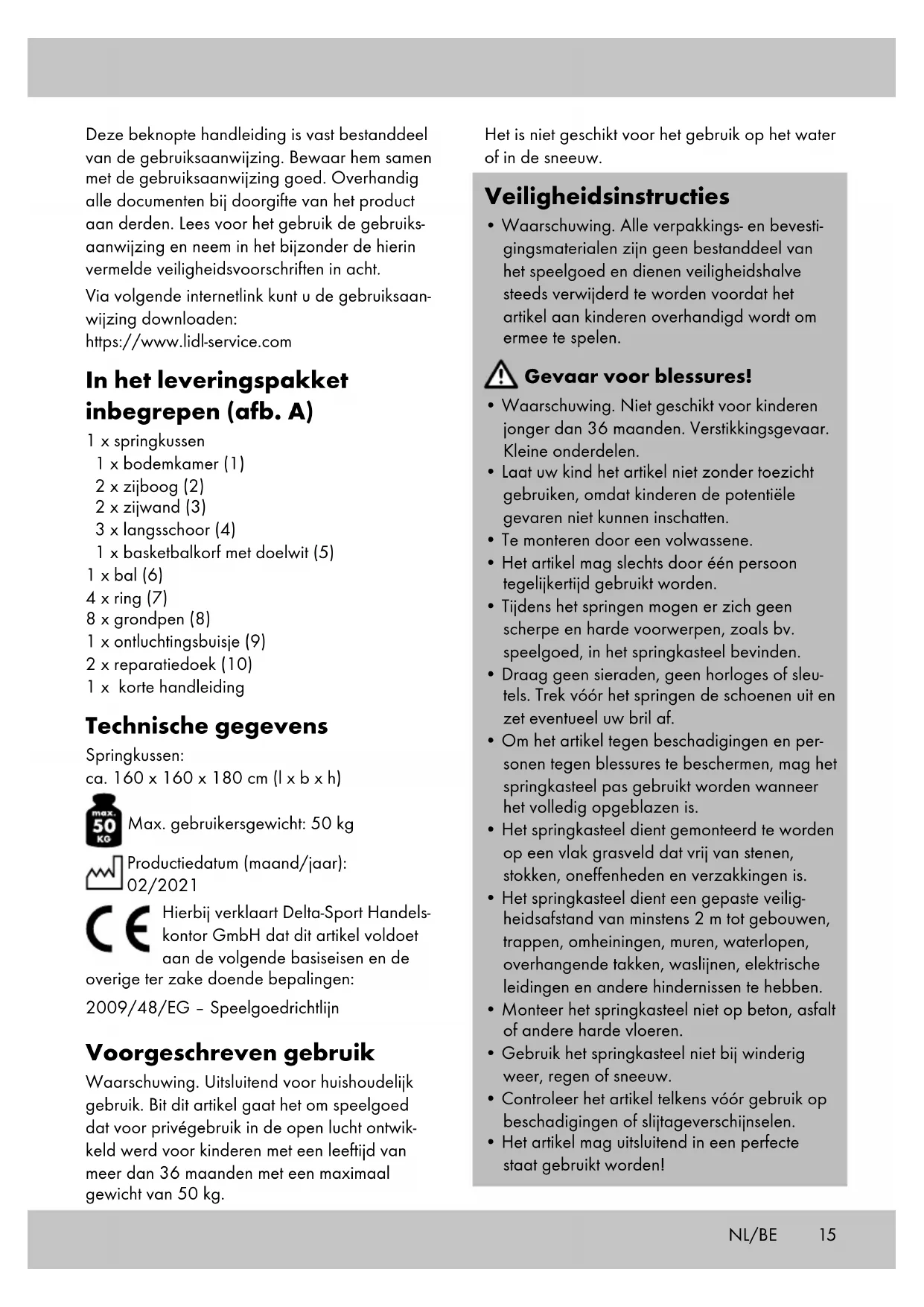 - Retirez la rustine du papier, placez-la sur la zone endommagée et appuyez fermement. FR/BE15 Deze beknopte handleiding is vast bestanddeel van de gebruiksaanwijzing. Bewaar hem samen met de gebruiksaanwijzing goed. Overhandig alle documenten bij doorgifte van het product aan derden. Lees voor het gebruik de gebruiks- aanwijzing en neem in het bijzonder de hierin vermelde veiligheidsvoorschriften in acht. Via volgende internetlink kunt u de gebruiksaan- wijzing downloaden: https://www.lidl-service.com In het leveringspakket inbegrepen (afb. A) 1 x springkussen 1 x bodemkamer (1) 2 x zijboog (2) 2 x zijwand (3) 3 x langsschoor (4) 1 x basketbalkorf met doelwit (5) 1 x bal (6) 4 x ring (7) 8 x grondpen (8) 1 x ontluchtingsbuisje (9) 2 x reparatiedoek (10) 1 x korte handleiding Technische gegevens Springkussen: ca. 160 x 160 x 180 cm (l x b x h) Max. gebruikersgewicht: 50 kg Productiedatum (maand/jaar): 02/2021 Hierbij verklaart Delta-Sport Handels- kontor GmbH dat dit artikel voldoet aan de volgende basiseisen en de overige ter zake doende bepalingen: 2009/48/EG – Speelgoedrichtlijn Voorgeschreven gebruik Waarschuwing. Uitsluitend voor huishoudelijk gebruik. Bit dit artikel gaat het om speelgoed dat voor privégebruik in de open lucht ontwik- keld werd voor kinderen met een leeftijd van meer dan 36 maanden met een maximaal gewicht van 50 kg. Het is niet geschikt voor het gebruik op het water of in de sneeuw. Veiligheidsinstructies