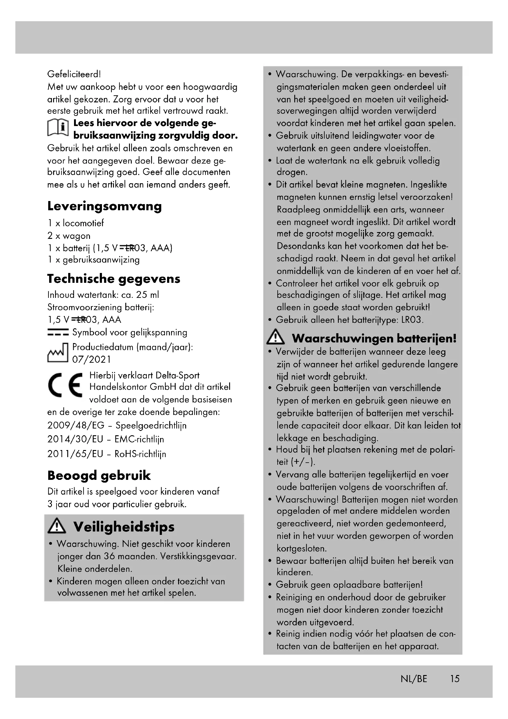 ton/80 - 98: composietmaterialen. Het artikel en de verpakkingsmaterialen zijn recyclebaar; voer ze gescheiden af voor een be- tere afvalbehandeling. Het Triman-logo is alleen van toepassing voor Frankrijk. Informatie over de mogelijkheden om het afgedankte artikel af te voeren, wordt verstrekt door de gemeentelijke overheid. Opmerkingen over garantie en serviceafhandeling Het artikel werd met de grootste zorgvuldigheid en onder permanent toezicht geproduceerd. De firma DELTA-SPORT HANDELSKONTOR GmbH verleent particuliere eindklanten op dit artikel drie jaar garantie, te rekenen vanaf de datum van aankoop (garantietermijn) en dit op grond van de volgende bepalingen. De garantie geldt alleen voor materiaal- en verwerkingsfouten. De garantie is niet van toepassing op onderde- len die aan een normale slijtage onderhevig zijn en daarom als niet-slijtvaste onderdelen te beschouwen zijn (bv. batterijen) en evenmin op breekbare onderdelen, bv. schakelaars, accu’s of onderdelen die van glas gemaakt zijn. Uit de garantie voortvloeiende claims zijn uitge- sloten als het artikel onvakkundig, verkeerd of niet in het kader van de voorziene bepaling of in het kader van het voorziene gebruiksdoeleinde gebruikt werd of indien richtlijnen in de gebruiks- aanwijzing niet in acht genomen werden, tenzij de eindklant aantoont dat er sprake is van een materiaal- of verwerkingsfout die niet op één van de hoger vermelde omstandigheden gebaseerd is. Uit de garantie voortvloeiende claims kunnen alleen tijdens de garantieperiode op vertoon van de originele kassabon ingediend wor- den. Gelieve daarom de originele kassabon te bewaren. De garantieperiode wordt door eventuele reparaties op grond van de garantie, wettelijke waarborg of coulance niet verlengd. Dit geldt ook voor vervangen en gerepareerde onderdelen. Gelieve u bij klachten in eerste instantie tot de hieronder vermelde servicehotline te richten of met ons per e-mail contact op te nemen. Is er sprake van een garantiegeval, dan wordt het ar- tikel door ons – naar onze keuze – voor u gratis gerepareerd, wordt het vervangen of wordt de aankoopsom terugbetaald. Verdere rechten op grond van de garantie bestaan niet. Uw wettelijke rechten, in het bijzonder rechten op garantie tegenover de betreffende verkoper, worden door deze garantie niet beperkt.18 IAN: 359779_2101 Service België Tel.: 070 270 171 (0,15 EUR/Min.) E-Mail: deltasport@lidl.be Service Nederland Tel.: 0900 0400223 (0,10 EUR/Min.) E-Mail: deltasport@lidl.nl NL/BE19 Gratulujemy! Decydując się na ten produkt, otrzymują Pań- stwo towar wysokiej jakości. Należy zapoznać się z produktem przed jego pierwszym użyciem. Należy uważnie przeczytać następującą instrukcję użytkowa- nia. Produkt ten należy użytkować wyłącznie w opisany sposób oraz zgodnie ze wskazanym przeznaczeniem. Niniejszą instrukcję użytko- wania należy przechowywać w bezpiecznym miejscu. Przekazując produkt innej osobie, należy upewnić się, że otrzyma ona także całą dokumentację dotyczącą produktu. Zakres dostawy 1 x lokomotywa 2 x wagon 1 x bateria (1,5 V LR03, AAA) 1 x instrukcja użytkowania Dane techniczne Pojemność zbiornika wody: ok. 25 ml Zasilanie bateriami: