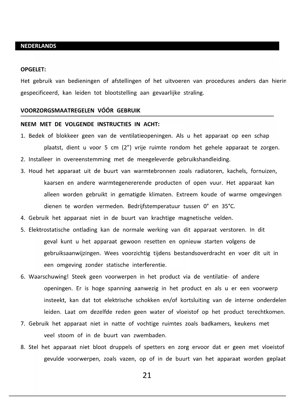 22. Plaats dit apparaat nooit op andere elektrische apparatuur.