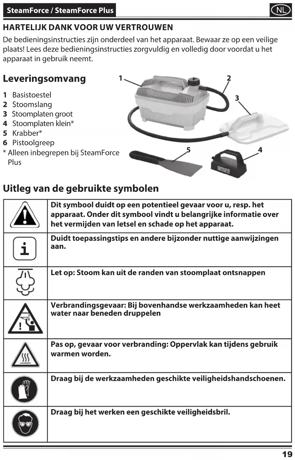 - Alleen inbegrepen bij SteamForce Plus Uitleg van de gebruikte symbolen Dit symbool duidt op een potentieel gevaar voor u, resp. het apparaat. Onder dit symbool vindt u belangrijke informatie over het vermijden van letsel en schade op het apparaat.