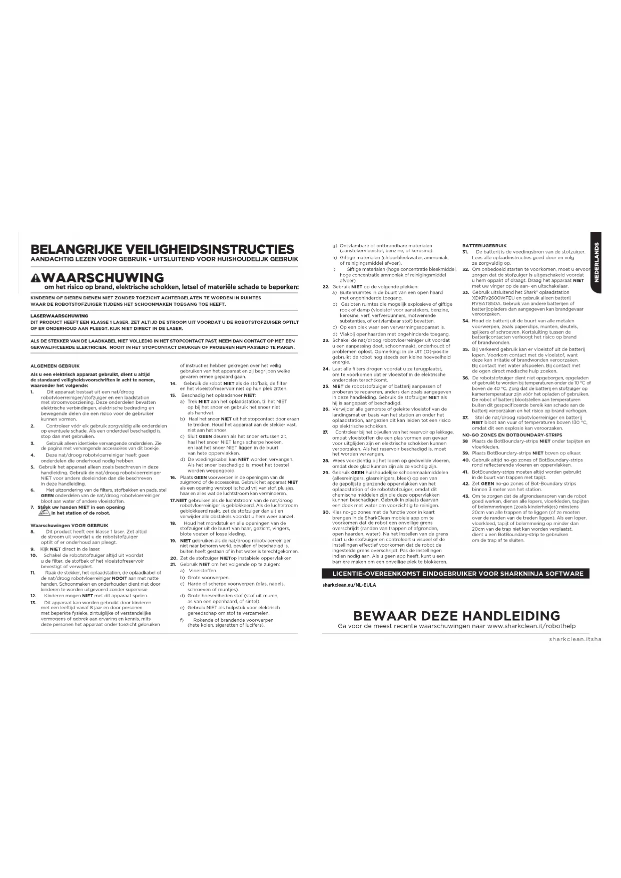 Als een klant een product in het Nederland koopt, kan de klant aanspraak maken op wettelijke rechten t.a.v. de kwaliteit van het product (uw "wettelijke rechten"). U kunt uw winkelier aan deze rechten houden. Maar bij Shark® zijn we zo overtuigd van de kwaliteit van onze producten, dat wij de originele eigenaar een extra fabrieksgarantie van maximaal twee jaar geven. Deze voorwaarden hebben alleen betrekking op onze fabrieksgarantie - uw wettelijke rechten blijven hierbij gelden. De onderstaande voorwaarden beschrijven de vereisten en omvang van onze garantie. Zij hebben geen invloed op uw wettelijke rechten of de verplichtingen van de verkoper van het product en uw overeenkomst met hen. Shark®-batterijgarantie Een huishoudelijk apparaat zoals een robotstofzuiger is een aanzienlijke investering. Uw nieuwe apparaat moet zo lang mogelijk correct werken. De garantie bij het apparaat is een belangrijke afweging - en laat zien hoeveel vertrouwen de fabrikant in zijn product heeft en in de kwaliteit hiervan. Ieder apparaat van Shark® wordt geleverd met garantie die onderdelen en arbeidskosten dekt. De helpdesk van onze klantenservice (0800- 862 0453) is bereikbaar van maandag t/m vrijdag tussen 09.00 en 18.00 uur. Het telefoonnummer is gratis en u wordt direct doorverbonden met een medewerker van Shark®. U kunt ook online ondersteuning vinden op www.sharkclean.eu. Hoe registreer ik mijn uitgebreide Shark®-garantie? U kunt uw garantie binnen 28 dagen na aankoop online registreren. Om tijd te besparen, heeft u de volgende informatie over uw apparaat nodig:
