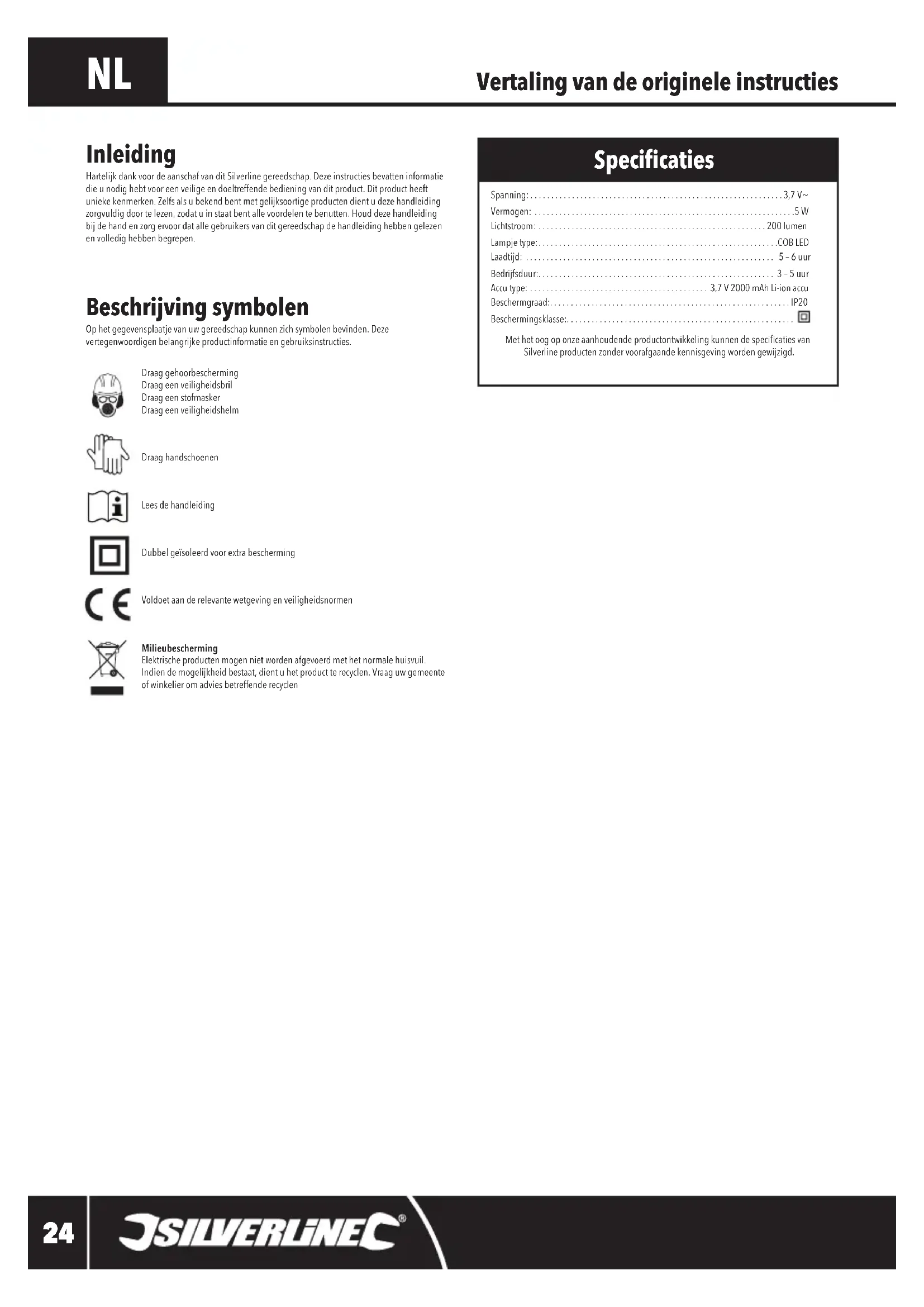 Spanning: .............................................................3,7V~ Vermogen: ...............................................................5 W Lichtstroom: .......................................................200 lumen Lampje type:..........................................................COB LED Laadtijd: ............................................................ 5 – 6 uur Bedrijfsduur:......................................................... 3 – 5 uur Accu type: ........................................... 3,7V2000mAhLi-ionaccu Beschermgraad:..........................................................IP20Beschermingsklasse:.......................................................MethetoogoponzeaanhoudendeproductontwikkelingkunnendespecicatiesvanSilverline producten zonder voorafgaande kennisgeving worden gewijzigd. Inleiding HartelijkdankvoordeaanschafvanditSilverlinegereedschap.Dezeinstructiesbevatteninformatiedie u nodig hebt voor een veilige en doeltreffende bediening van dit product. Dit product heeft unieke kenmerken. Zelfs als u bekend bent met gelijksoortige producten dient u deze handleiding zorgvuldigdoortelezen,zodatuinstaatbentallevoordelentebenutten.Houddezehandleidingbij de hand en zorg ervoor dat alle gebruikers van dit gereedschap de handleiding hebben gelezen en volledig hebben begrepen. Specicaties 511273_Manual.indd 24 08/01/2019 14:545 W Lithium oplaadbare zaklamp511273