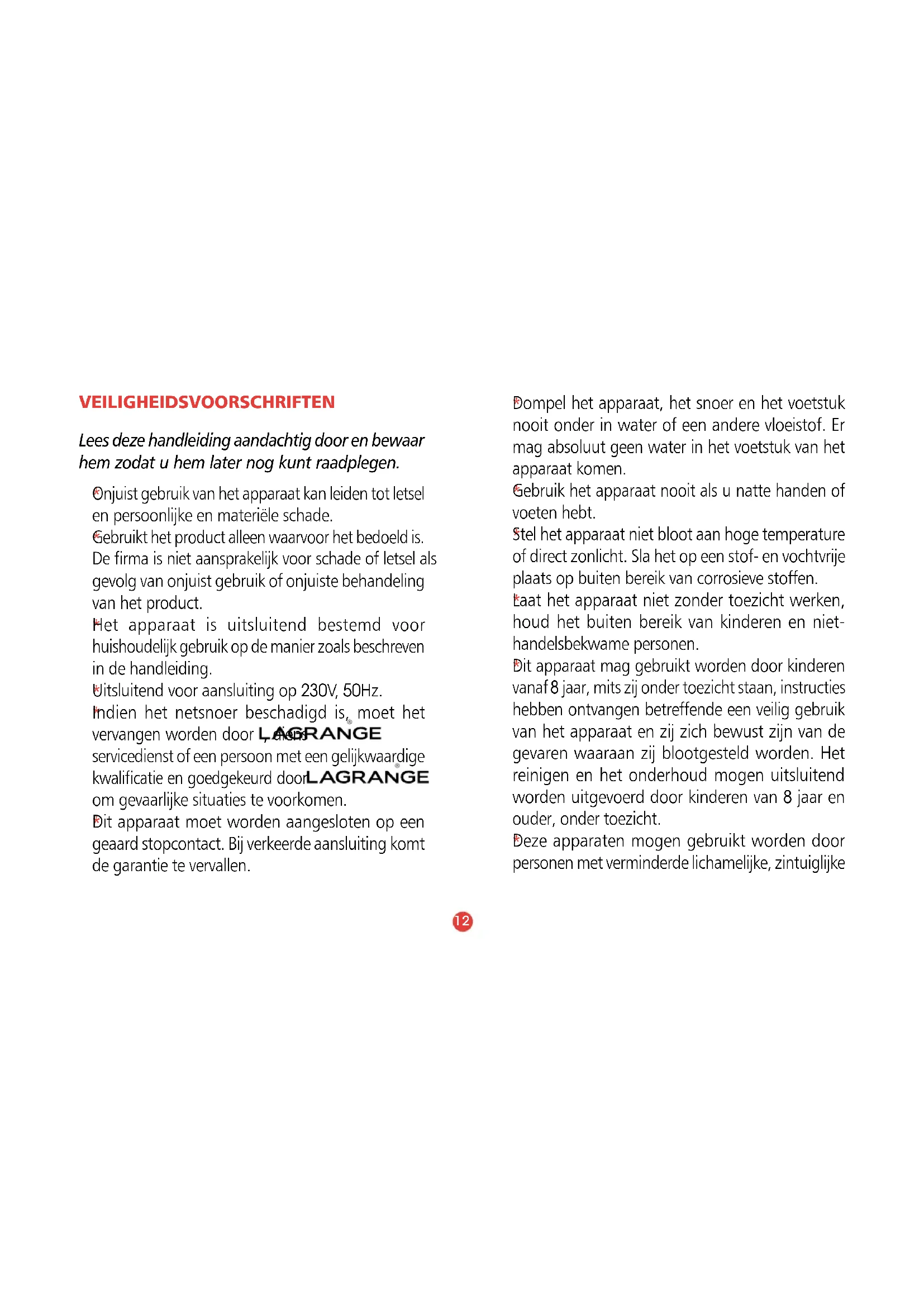 De garantie van dit apparaat is 2 jaar. Wilt u de garantie gratis met een jaar verlengen, schrijf u dan in op de website van (www.lagrange.fr). De garantie geldt voor onderdelen en manuren en dekt fabricagefouten. Buiten de garantie vallen: beschadiging die voortkomen uit verkeerd gebruik of het niet naleven van de gebruiksaanwijzing en schade door vallen. DEZE GARANTIE IS UITSLUITEND VAN TOEPASSING OP HUISHOUDELIJK. GEBRUIK, EN IN GEEN GEVAL OP PROFESSIONEEL OF SEMIPROFESSIONEEL GEBRUIK. De wettelijk verplichte garantie van de verkoper sluit in niets de wettelijke garantie van de producent uit voor wat betreft fabricagefouten of verborgen gebreken, volgens artikel 1641 tot 1649 van het Franse Burgerlijk Wetboek. Neem bij storingen of slecht functioneren contact op met uw verkoper. In geval van een technisch defect binnen 8 dagen volgend op de aankoopdatum wordt het apparaat vervangen. Na het verstrijken van deze periode wordt het apparaat gerepareerd door de klantenservice van . Om aanspraak te kunnen maken op deze garantie is de gebruiker verplicht een kopie van de factuur te overleggen waarop de aankoopdatum vermeld staat. Beschikbaarheidsduur van reserveonderdelen In overeenstemming met artikel L 111-2 van de Franse consumentenwet is de duur van beschikbaarheid van reserveonderdelen die wij op voorraad houden voor repareerbare producten