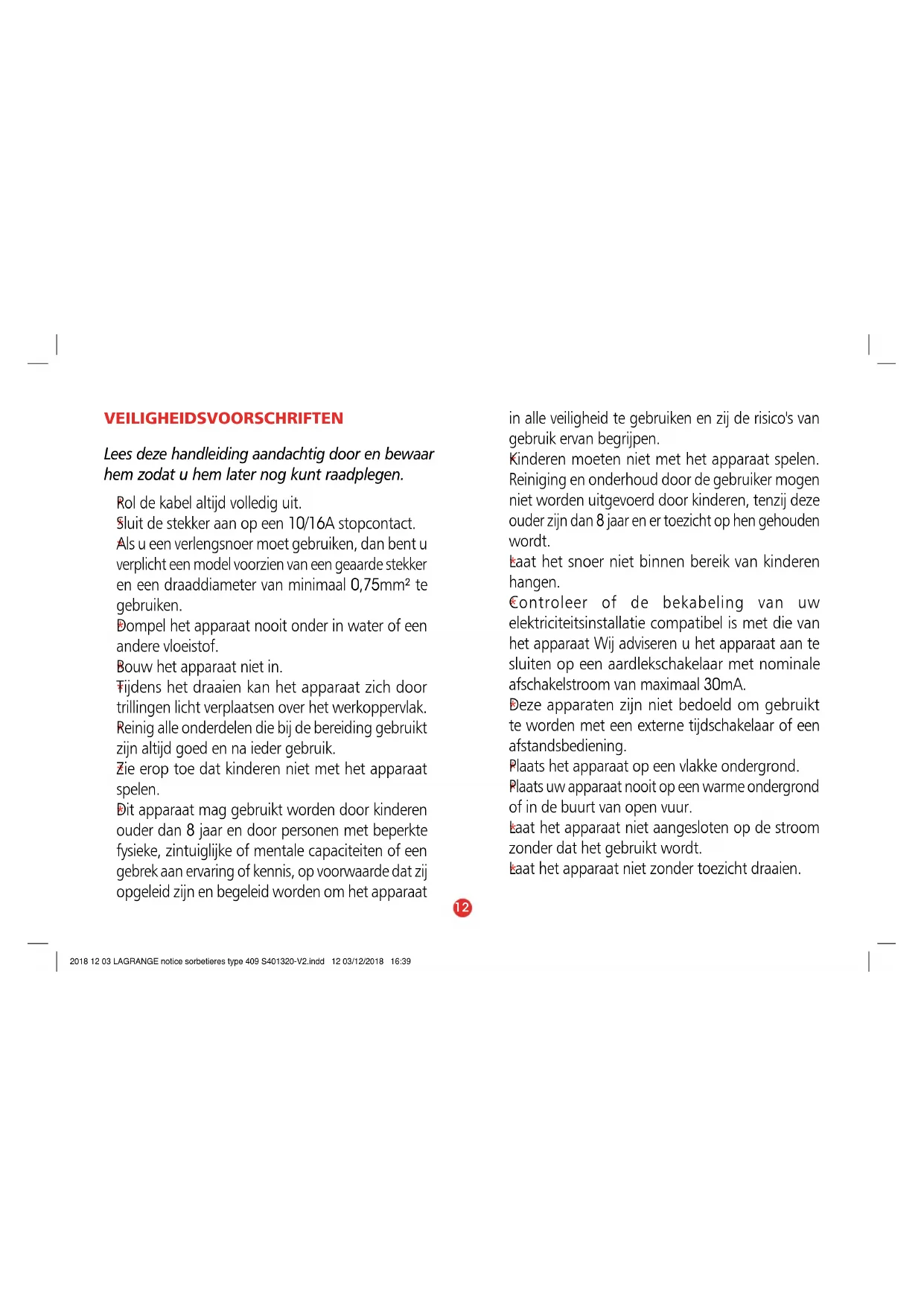 2018 12 03 LAGRANGE notice sorbetieres type 409 S401320-V2.indd 11 03/12/2018 16:39VEILIGHEIDSVOORSCHRIFTEN Lees deze handleiding aandachtig door en bewaar hem zodat u hem later nog kunt raadplegen.