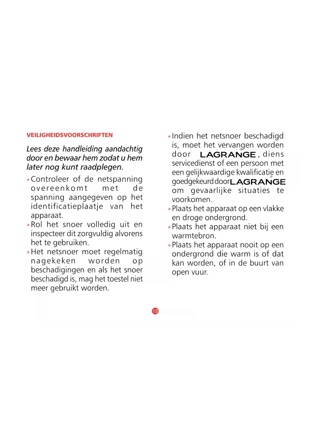 Reinigen met een zachte spons met een beetje water en afwasmiddel. De accessoires kunnen ook in de vaatwasser. 20ALGEMENE GARANTIEVOORWAARDEN Garantie voor elektrische huishoudelijke apparaten . De garantie van dit apparaat is 4 jaar. Wilt u de garantie gratis met een jaar verlengen, schrijf u dan in op de website van (www.lagrange.fr). De garantie geldt voor onderdelen en manuren en dekt fabricagefouten. Buiten de garantie vallen: beschadiging die voortkomen uit verkeerd gebruik of het niet naleven van de handleiding en schade door vallen. DEZE GARANTIE BEPERKT ZICH TOT HUISHOUDELIJK GEBRUIK EN IN GELDT IN GEEN GEVAL BIJ BEROEPSMATIG GEBRUIK. De wettelijk verplichte garantie van de verkoper sluit in niets de wettelijke garantie van de producent uit voor wat betreft fabricagefouten, volgens artikel 1641 en verder van het Franse Burgerlijk Wetboek. Neem bij storingen of slecht functioneren contact op met uw verkoper. In geval van een technisch defect binnen 8 dagen volgend op de aankoopdatum wordt het apparaat vervangen. Na verstrijken van deze periode wordt het apparaat gerepareerd door de klantenservice van