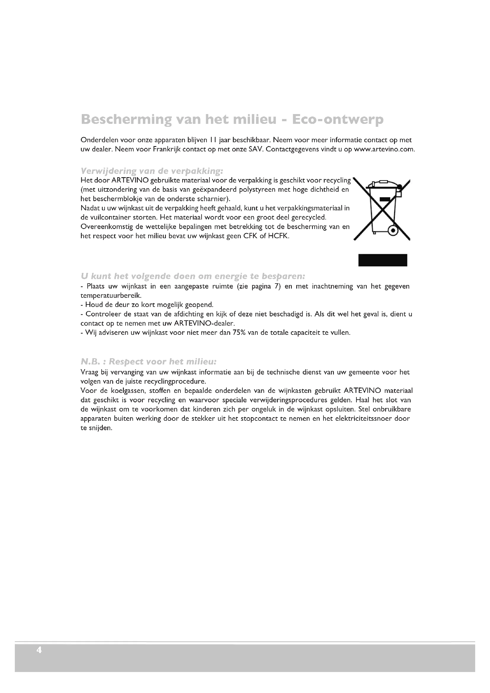 Inhoudsopgave Bescherming van het milieu - Eco-ontwerp ............................................................................................................P 4 Beschrijving van uw wijnkast ......................................................................................................................................P 5 Belangrijke informatie over wijn ................................................................................................................................P 6 Elektrische aansluiting ..................................................................................................................................................P 6 Installatie van uw wijnkast ......................................................................................................................................P 6-7 Links- of rechtsom draaiende deur (alleen mogelijk op de glazen deur) ......................................................P. 8-9 Adviezen voor de inrichting en het vullen ...................................................................................................... P 10-11 Ingebruikname en temperatuurregeling .......................................................................................................... P 12-13 Algemeen onderhoud van uw wijnkast ................................................................................................................. P 14 Storingen ...................................................................................................................................................................... P 15 Normen ....................................................................................................................................................................... P 15 Technische kenmerken ............................................................................................................................................. P 16 Nederlands4 Bescherming van het milieu - Eco-ontwerp Onderdelen voor onze apparaten blijven 11 jaar beschikbaar. Neem voor meer informatie contact op met uw dealer. Neem voor Frankrijk contact op met onze SAV. Contactgegevens vindt u op www.artevino.com. Verwijdering van de verpakking: Het door ARTEVINO gebruikte materiaal voor de verpakking is geschikt voor recycling (met uitzondering van de basis van geëxpandeerd polystyreen met hoge dichtheid en het beschermblokje van de onderste scharnier). Nadat u uw wijnkast uit de verpakking heeft gehaald, kunt u het verpakkingsmateriaal in de vuilcontainer storten. Het materiaal wordt voor een groot deel gerecycled. Overeenkomstig de wettelijke bepalingen met betrekking tot de bescherming van en het respect voor het milieu bevat uw wijnkast geen CFK of HCFK. U kunt het volgende doen om energie te besparen: - Plaats uw wijnkast in een aangepaste ruimte (zie pagina 7) en met inachtneming van het gegeven temperatuurbereik. - Houd de deur zo kort mogelijk geopend. - Controleer de staat van de afdichting en kijk of deze niet beschadigd is. Als dit wel het geval is, dient u contact op te nemen met uw ARTEVINO-dealer. - Wij adviseren uw wijnkast voor niet meer dan 75% van de totale capaciteit te vullen. N.B. : Respect voor het milieu: Vraag bij vervanging van uw wijnkast informatie aan bij de technische dienst van uw gemeente voor het volgen van de juiste recyclingprocedure. Voor de koelgassen, stoffen en bepaalde onderdelen van de wijnkasten gebruikt ARTEVINO materiaal dat geschikt is voor recycling en waarvoor speciale verwijderingsprocedures gelden. Haal het slot van de wijnkast om te voorkomen dat kinderen zich per ongeluk in de wijnkast opsluiten. Stel onbruikbare apparaten buiten werking door de stekker uit het stopcontact te nemen en het elektriciteitssnoer door te snijden.NL