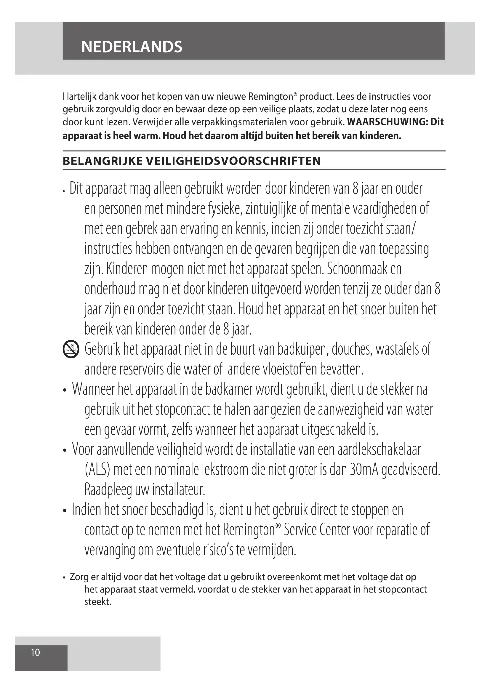- Indien het snoer beschadigd is, dient u het gebruik direct te stoppen en contact op te nemen met het Remington® Service Center voor reparatie of vervanging om eventuele risico’s te vermijden.