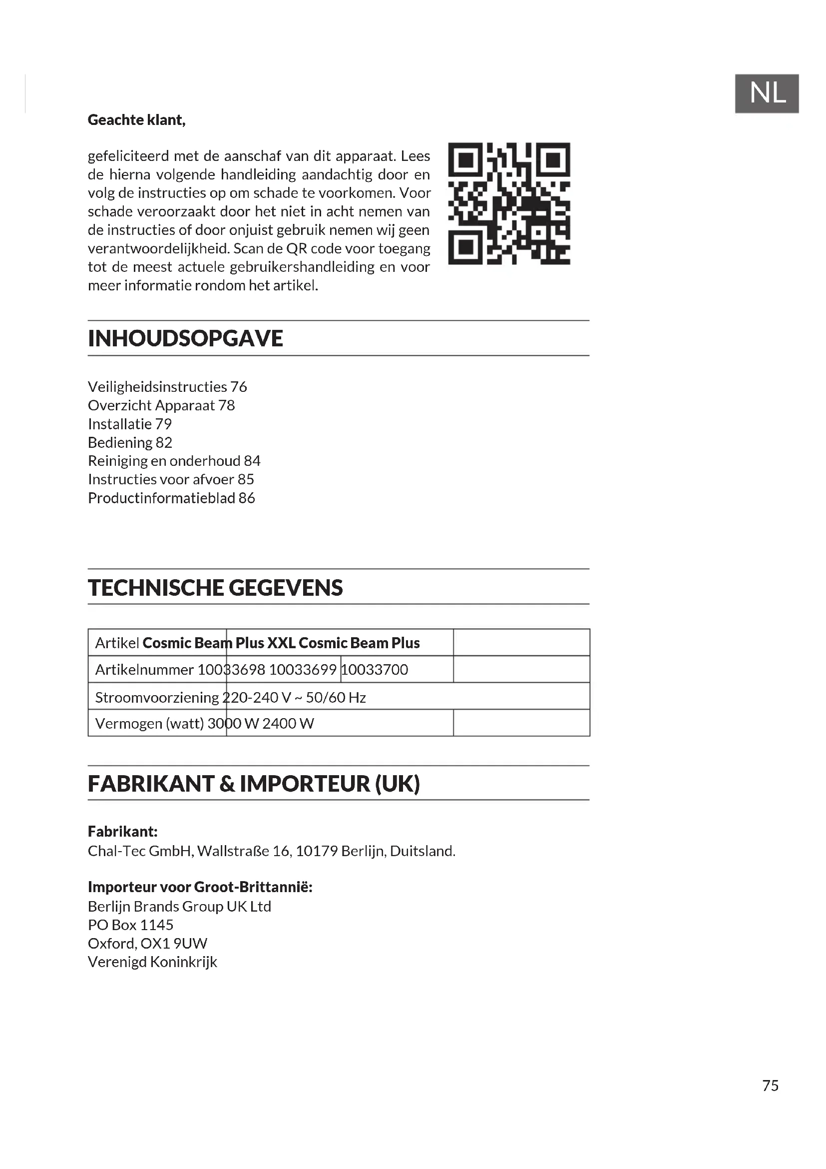 Geachte klant, gefeliciteerd met de aanschaf van dit apparaat. Lees de hierna volgende handleiding aandachtig door en volg de instructies op om schade te voorkomen. Voor schade veroorzaakt door het niet in acht nemen van de instructies of door onjuist gebruik nemen wij geen verantwoordelijkheid. Scan de QR code voor toegang tot de meest actuele gebruikershandleiding en voor meer informatie rondom het artikel. INHOUDSOPGAVE TECHNISCHE GEGEVENS Artikel Cosmic Beam Plus XXL Cosmic Beam Plus Artikelnummer 10033698 10033699 10033700 Stroomvoorziening 220-240 V ~ 50/60 Hz Vermogen (watt) 3000 W 2400 W FABRIKANT & IMPORTEUR (UK) Fabrikant: Chal-Tec GmbH, Wallstraße 16, 10179 Berlijn, Duitsland. Importeur voor Groot-Brittannië: Berlijn Brands Group UK Ltd PO Box 1145 Oxford, OX1 9UW Verenigd Koninkrijk Veiligheidsinstructies 76 Overzicht Apparaat 78 Installatie 79 Bediening 82 Reiniging en onderhoud 84 Instructies voor afvoer 85 Productinformatieblad 8676