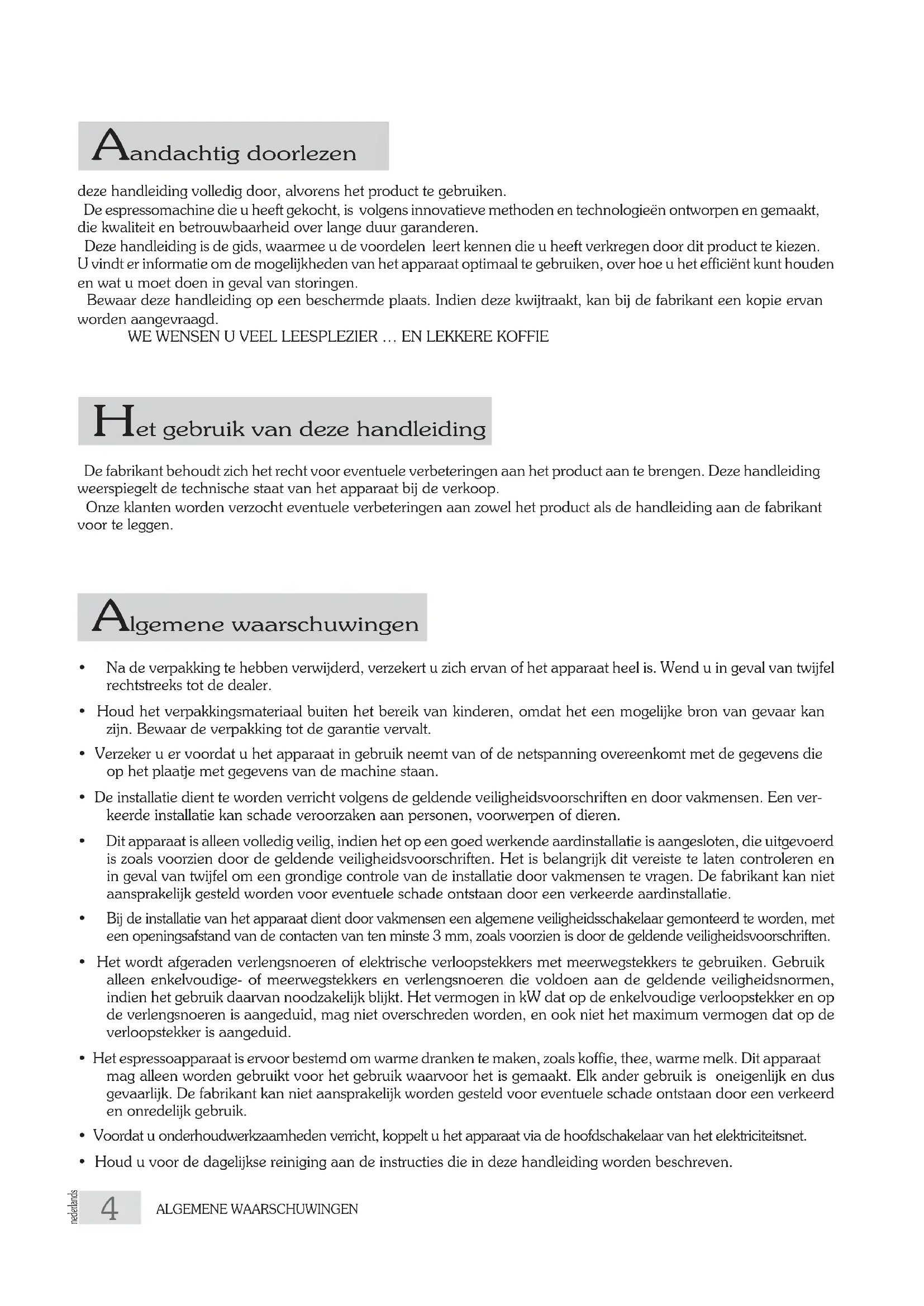 - Houd u voor de dagelijkse reiniging aan de instructies die in deze handleiding worden beschreven. Aandachtig doorlezen Het gebruik van deze handleiding Algemene waarschuwingen5 nederlands NEDERLANDS INLEIDING• Het gebruik van een elektrisch apparaat brengt de inachtneming van enkele gedragsvoorschriften met betrekking tot de veiligheid met zich mee : - kom niet aan het apparaat als u natte of vochtige handen of voeten heeft; - gebruik het apparaat niet op blote voeten; - gebruik geen verlengsnoeren in badkamers of douchecellen; - trek niet aan de stroomkabel om het apparaat uit het stopcontact te halen; - stel het apparaat niet bloot aan weersinvloeden (regen, zon, enz.) - zorg dat het apparaat niet wordt gebruikt door kinderen of onbevoegden.• Schakel het apparaat bij storing of slechte werking uit, probeer het niet te repareren, maar wend u tot een gespe-cialiseerde technicus. Eventuele reparaties dienen alleen door de fabrikant of door een erkende servicedienst verricht te worden, waarbij uitsluitend originele reserveonderdelen gebruikt dienen te worden. Door de niet-inachtneming van deze voorschriften, kan de veiligheid van het apparaat in gevaar gebracht worden en komt de garantie te vervallen.• De stroomkabel van het apparaat mag niet door de gebruiker worden vervangen. Schakel het apparaat bij bescha-diging van de kabel uit en wend u uitsluitend tot vakmensen.• Indien u besluit het apparaat niet meer te gebruiken, wordt aangeraden het door vakmensen van het elektriciteitsnet te laten koppelen en deze er het water uit te laten halen.• Om een goede werking van het apparaat te garanderen, moeten de door de fabrikant gegeven instructies worden opgevolgd en moet het apparaat regelmatig onderhouden worden door vakmensen, die ook alle veiligheidsuit-rustingen moeten controleren.• Kom niet met de handen of andere lichaamsdelen in de buurt van de openingen waar koffie, stoom of warm water uitkomt. De stoom en het water die uit de pijpjes komen, kunnen brandwonden veroorzaken.• Tijdens de werking van het apparaat zijn de stoom- en waterpijpjes en de filterhouders oververhit en mag u er alleen op de aangegeven punten voorzichtig aankomen.• Koppen en kopjes moeten op de speciale kopjesverwarmer worden gezet, maar alleen nadat ze goed zijn afgedroogd.• Op de kopjesverwarmer moeten ook de spullen van de machine zelf worden gelegd. Er mogen geen andere voor-werpen op worden gelegd.• Bij ongeautoriseerd geknoei aan delen van het apparaat komt de garantie te vervallen.GARANTIE 12 maanden op alle onderdelen, op de elektrische en elektronische onderdelen, en de onderdelen die aan normale slijtage onderhevig zijn na.