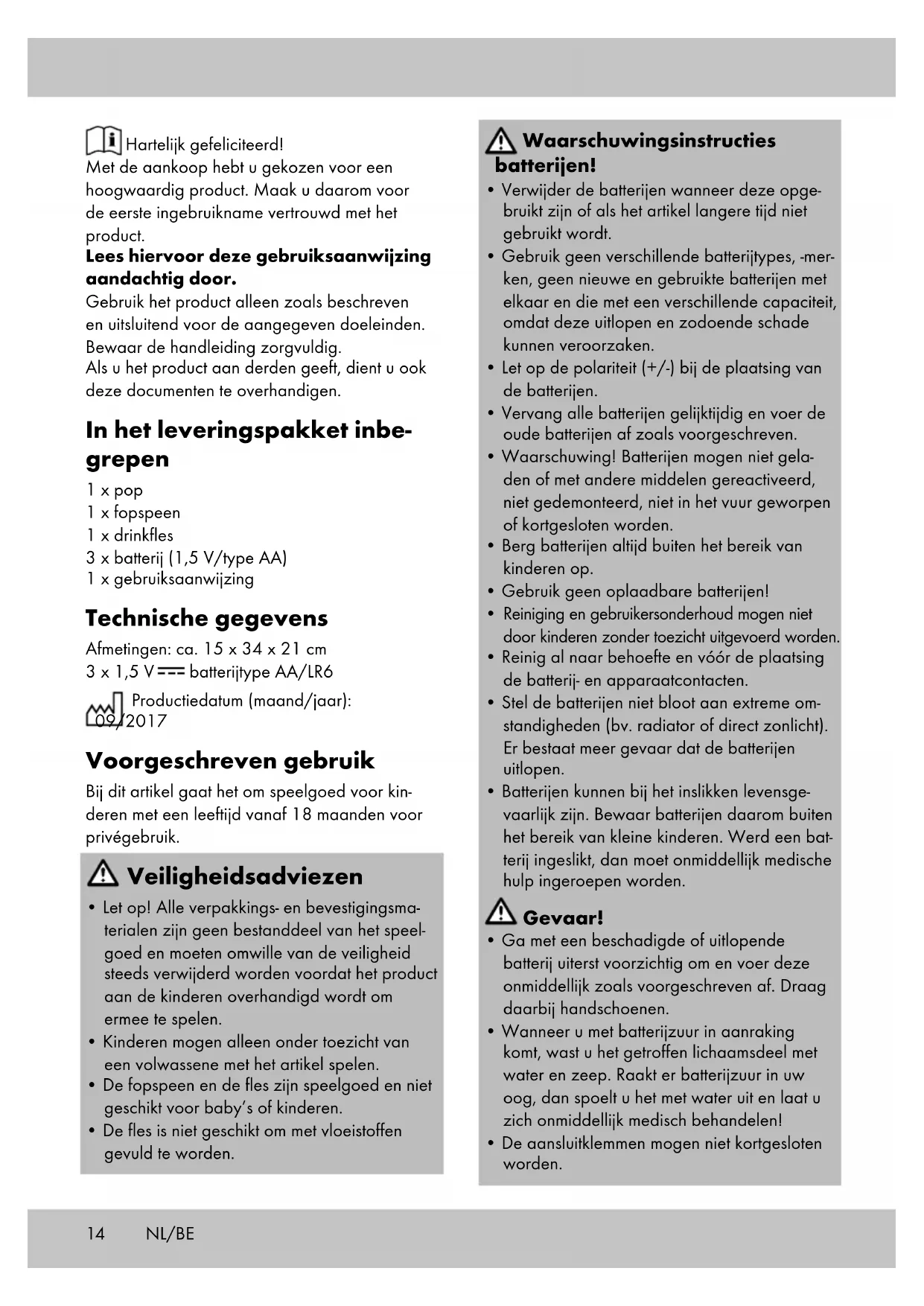 - Wanneer er nogmaals op gedrukt wordt, weerklinken er nog andere geluiden. Opmerking: In totaal weerklinken er 16 verschillende klanken wanneer u op de buik van de pop drukt. Opslag, reiniging Het artikel altijd droog en netjes in een op tem- peratuur gebrachte kamer opbergen. Uitsluitend met een droge reinigingsdoek schoonvegen. BELANGRIJK! Nooit met chemische reinigings- middelen reinigen. Kleding en muts van de pop: Afvalverwerking Voer het artikel en verpakkingsmaterialen in overeenstemming met actuele lokale voor- schriften af. Verpakkingsmaterialen, zoals bv. foliezakjes, horen niet thuis in kinderhanden. Berg het verpakkingsmateriaal buiten het bereik van kinderen op. Apparaten die met het hiernaast afgebe- elde symbool gemarkeerd zijn, mogen niet samen met het huisvuil afgevoerd worden. U bent verplicht, dergelijke oude elektrische en elektronische apparaten afzonderlijk af te voeren. Gelieve bij uw gemeentebestuur naar de mogelijkheden van een reguliere afvalverwijde- ring te informeren. Verwijder de batterij uit het artikel vóór de afvoer.16 Verwijderingsmaatregelen batterijen In acht nemen a.u.b.: Omdat het bij batterijen om bijzonder afval gaat dat volgens de wet niet samen met het huisvuil afgevoerd mag worden. U kunt onbruik- bare batterijen op de gemeentelijke inzamelpun- ten of in de handel afgeven. Hier staan speciale verzamelbakken ter beschikking. Opmerkingen over garantie en serviceafhandeling Het product is geproduceerd met grote zorg en onder voortdurende controle. U ontvangt een garantie van drie jaar op dit product, vanaf de datum van aankoop. Bewaar alstublieft uw aankoopbewijs. De garantie geldt alleen voor materiaal- en fa- bricagefouten en vervalt bij foutief of oneigenlijk gebruik. Uw wettelijke rechten, met name het garantierecht, worden niet beïnvloed door deze garantie. In geval van reclamaties dient u zich aan de beneden genoemde service-hotline te wenden of zich per e-mail met ons in verbinding te zetten. Onze servicemedewerkers zullen de verdere handelswijze zo snel mogelijk met u afspreken. Wij zullen u in ieder geval persoonlijk te woord staan. De garantieperiode wordt na eventuele repa- raties en op basis van de garantie, wettelijke garantie of coulance niet verlengd. Dit geldt ook voor vervangen en gerepareerde delen. Na afloop van de garantieperiode dienen even- tuele reparaties te worden betaald. IAN: 290753 Service België Tel.: 070 270 171 (0,15 EUR/Min.) E-Mail: deltasport@lidl.be Service Nederland Tel.: 0900 0400223 (0,10 EUR/Min.) E-Mail: deltasport@lidl.nl NL/BE17CZ Srdečně blahopřejeme! Vaší koupí jste se rozhodli pro jakostní produkt. Před uvedením do provozu se nejdříve seznamte s celým produktem. Přečtěte si pozorně následující návod k obsluze. Používejte produkt jen tak, jak je popsáno a jen v doporučených oblastech. Uschovejte si tento návod. Při předávání produktu třetí osobě předávejte i všechny příslušné podklady. Rozsah dodávky 1 x panenka 1 x dudlík 1 x láhev na pití 3 x baterie (1,5 V/typ AA) 1 x návod k obsluze Technické údaje Rozměry: cca 15 x 34 x 21 cm 3 x 1,5 V baterie typ AA/LR6 Datum výroby (měsíc/rok): 09/2017 Použití ke stanovenému účelu Tento výrobek je hračka pro děti od 18 měsíců pro privátní použití. Bezpečnostní pokyny