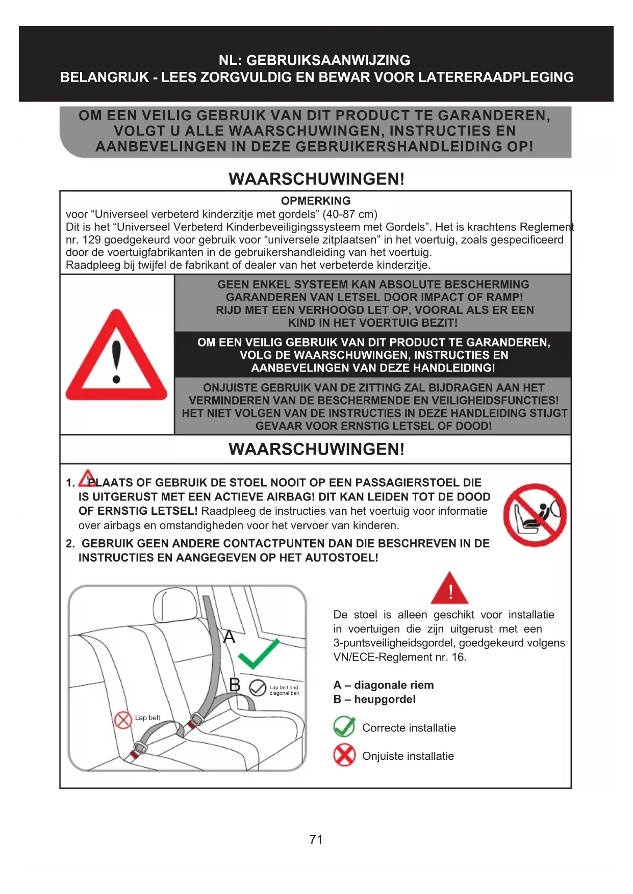 AANBEVELINGEN IN DEZE GEBRUIKERSHANDLEIDING OP! WAARSCHUWINGEN! OPMERKINGvoor “Universeel verbeterd kinderzitje met gordels” (40-87 cm)Dit is het “Universeel Verbeterd Kinderbeveiligingssysteem met Gordels”. Het is krachtens Reglement nr. 129 goedgekeurd voor gebruik voor “universele zitplaatsen” in het voertuig, zoals gespeciceerd door de voertuigfabrikanten in de gebruikershandleiding van het voertuig.Raadpleeg bij twijfel de fabrikant of dealer van het verbeterde kinderzitje.GEEN ENKEL SYSTEEM KAN ABSOLUTE BESCHERMING GARANDEREN VAN LETSEL DOOR IMPACT OF RAMP! RIJD MET EEN VERHOOGD LET OP, VOORAL ALS ER EEN KIND IN HET VOERTUIG BEZIT!OM EEN VEILIG GEBRUIK VAN DIT PRODUCT TE GARANDEREN,VOLG DE WAARSCHUWINGEN, INSTRUCTIES EN AANBEVELINGEN VAN DEZE HANDLEIDING!ONJUISTE GEBRUIK VAN DE ZITTING ZAL BIJDRAGEN AAN HET VERMINDEREN VAN DE BESCHERMENDE EN VEILIGHEIDSFUNCTIES!HET NIET VOLGEN VAN DE INSTRUCTIES IN DEZE HANDLEIDING STIJGTGEVAAR VOOR ERNSTIG LETSEL OF DOOD! WAARSCHUWINGEN! 1. PLAATS OF GEBRUIK DE STOEL NOOIT OP EEN PASSAGIERSTOEL DIE IS UITGERUST MET EEN ACTIEVE AIRBAG! DIT KAN LEIDEN TOT DE DOOD OF ERNSTIG LETSEL! Raadpleeg de instructies van het voertuig voor informatie over airbags en omstandigheden voor het vervoer van kinderen.2. GEBRUIK GEEN ANDERE CONTACTPUNTEN DAN DIE BESCHREVEN IN DE INSTRUCTIES EN AANGEGEVEN OP HET AUTOSTOEL!Lap beltLap belt anddiagonal belt