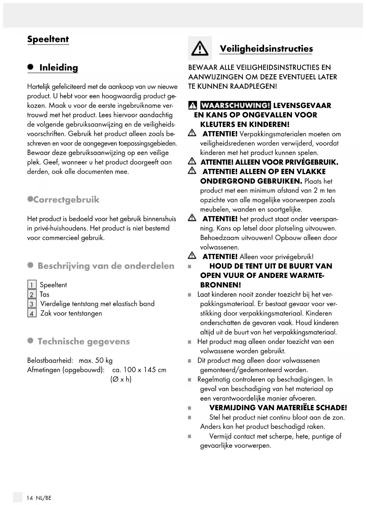 Demontage en opslag Verwijder de tentstangen uit het product. Vouw het product op en berg het op in de tas (afb. D). Reiniging Reinig het product alleen aan de buitenzijde met een zachte, vochtige doek. Afvoer De verpakking bestaat uit milieuvriendelijke grond- stoffen die u via de plaatselijke recyclingcontainers kunt afvoeren. Informatie over de mogelijkheden om het uitgediende product na gebruik te verwijderen, verstrekt uw ge- meentelijke overheid. Garantie Het product wordt volgens strenge kwaliteitsrichtlijnen zorgvuldig geproduceerd en voor levering grondig getest. In geval van schade aan het product kunt u rechtmatig beroep doen op de verkoper van het product. Deze wettelijke rechten worden door onze hierna vermelde garantie niet beperkt. Op dit product verlenen wij 3 jaar garantie vanaf aankoopdatum. De garantieperiode start op de dag van aankoop. Bewaar de originele kassabon alstublieft. Dit document is nodig als bewijs voor aankoop. Wanneer binnen 3 jaar na de aankoopdatum van dit product een materiaal- of productiefout optreedt, dan wordt het product door ons – naar onze keuze – gratis voor u gerepareerd of vervangen. Deze ga- rantie komt te vervallen als het product beschadigd wordt, niet correct gebruikt of onderhouden wordt. De garantie geldt voor materiaal- en productiefouten. Deze garantie is niet van toepassing op producton- derdelen, die onderhevig zijn aan normale slijtage en hierdoor als aan slijtage onderhevige onderde- len gelden (bijv. batterijen) of voor beschadigingen aan breekbare onderdelen, zoals bijv. schakelaars, accu’s of dergelijke onderdelen, die gemaakt zijn van glas. Afwikkeling in geval van garantie Om een snelle afhandeling van uw reclamatie te waarborgen dient u de volgende instructies in acht te nemen: Houd bij alle vragen alstublieft de kassabon en het artikelnummer (bijv. IAN 123456_7890) als bewijs van aankoop bij de hand.16 NL/BE Het artikelnummer vindt u op de typeplaat, ingegra- veerd, op het titelblad van uw handleiding (linksond er) of als sticker op de achter- of onderzijde. Wanneer er storingen in de werking of andere gebre- ken optreden, dient u eerst telefonisch of per e-mail contact met de onderstaande service-afdeling op te nemen. Een als defect geregistreerd product kunt u dan samen met uw aankoopbewijs (kassabon) en ver- melding van de concrete schade alsmede het tijdstip van optreden voor u franco aan het u meegedeelde servicepunt verzenden. Service Service Nederland Tel.: 08000225537 E-Mail: owim@lidl.nl Service Belgiё Tel.: 080071011 Tel.: 80023970 (Luxemburg) E-Mail: owim@lidl.be17 PL Namiot do zabawy Wstęp Gratulujemy Państwu zakupu nowego produktu. Zdecydowali się Państwo na zakup produktu naj- wyższej jakości. Przed uruchomieniem urządzenia po raz pierwszy zapoznaj się z nim. W tym celu przeczytaj uważnie poniższą instrukcję obsługi oraz wskazówki dotyczące bezpieczeństwa. Produkt na- leży użytkować w sposób tu opisany i zgodnie z określonym zakresem zastosowania. Należy prze- chowywać tę instrukcję w bezpiecznym miejscu. Przekazując produkt innej osobie, należy również przekazać wszystkie dokumenty. Zastosowanie zgodne z przeznaczeniem Niniejszy produkt przeznaczony jest wyłącznie do użytku w pomieszczeniach w gospodarstwie domowym. Produkt nie jest przeznaczony do użytku komercyjnego. Opis części