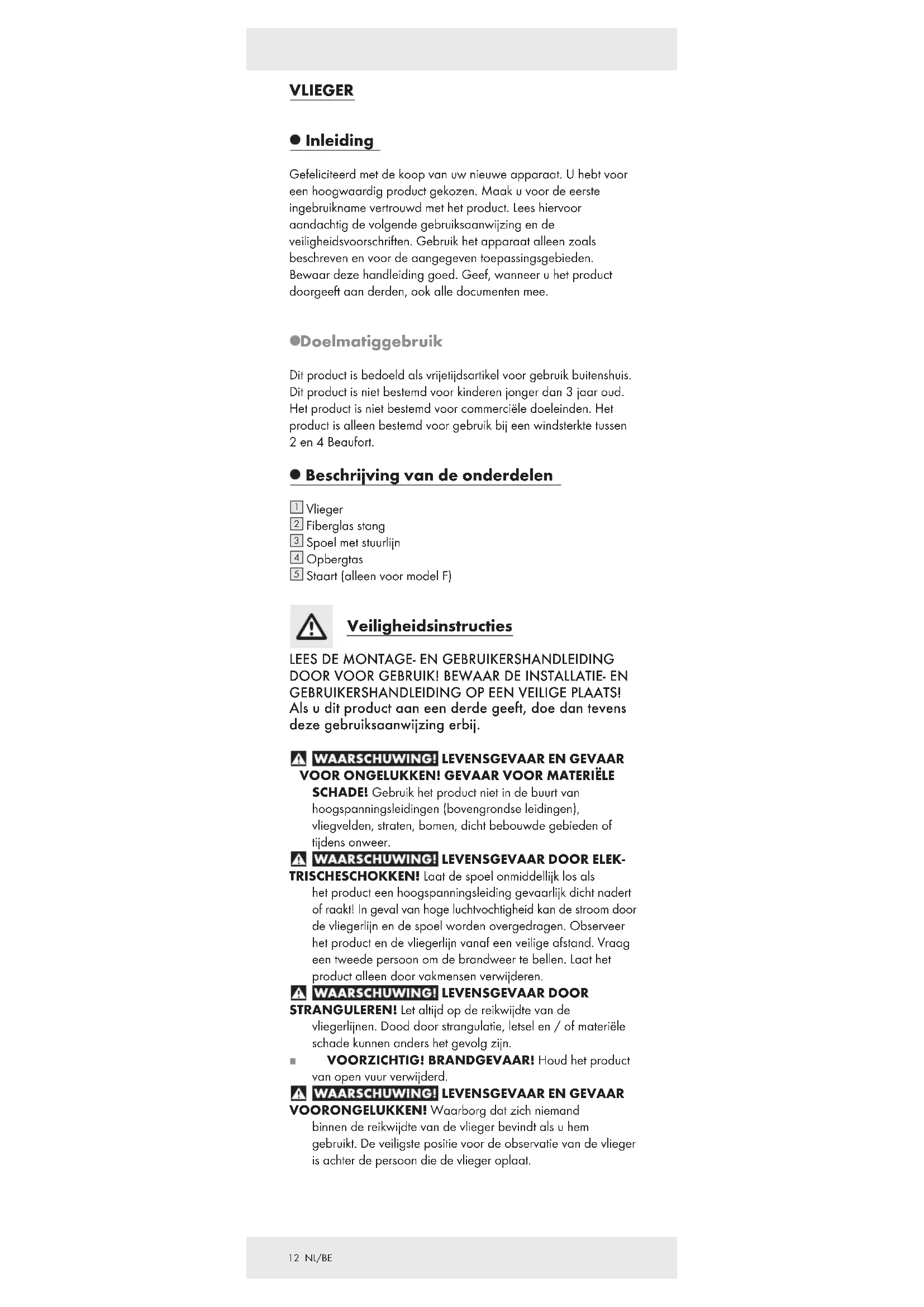 VOOR ONGELUKKEN! Waarborg dat zich niemand binnen de reikwijdte van de vlieger bevindt als u hem gebruikt. De veiligste positie voor de observatie van de vlieger is achter de persoon die de vlieger oplaat.13 NL/BE VORSICHT! GEVAAR VOOR LETSEL! Door heftige windstoten kan de spoel breken of de vliegerlijn scheuren. Draag daarom veiligheidshandschoenen als u het product gebruikt.