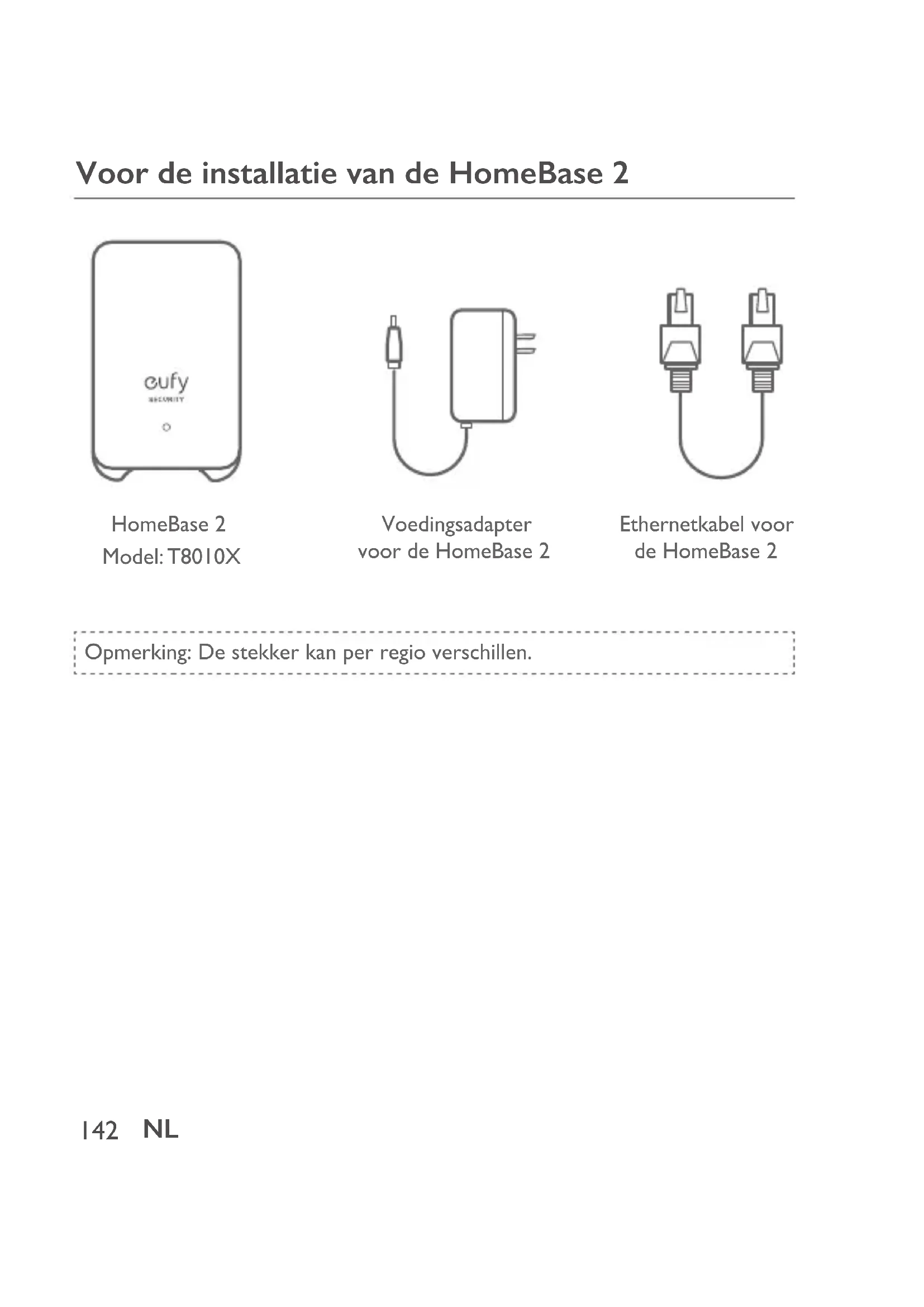 Voor de installatie van de HomeBase 2 HomeBase 2 Model: T8010X Voedingsadapter voor de HomeBase 2 Ethernetkabel voor de HomeBase 2 Opmerking: De stekker kan per regio verschillen.NL