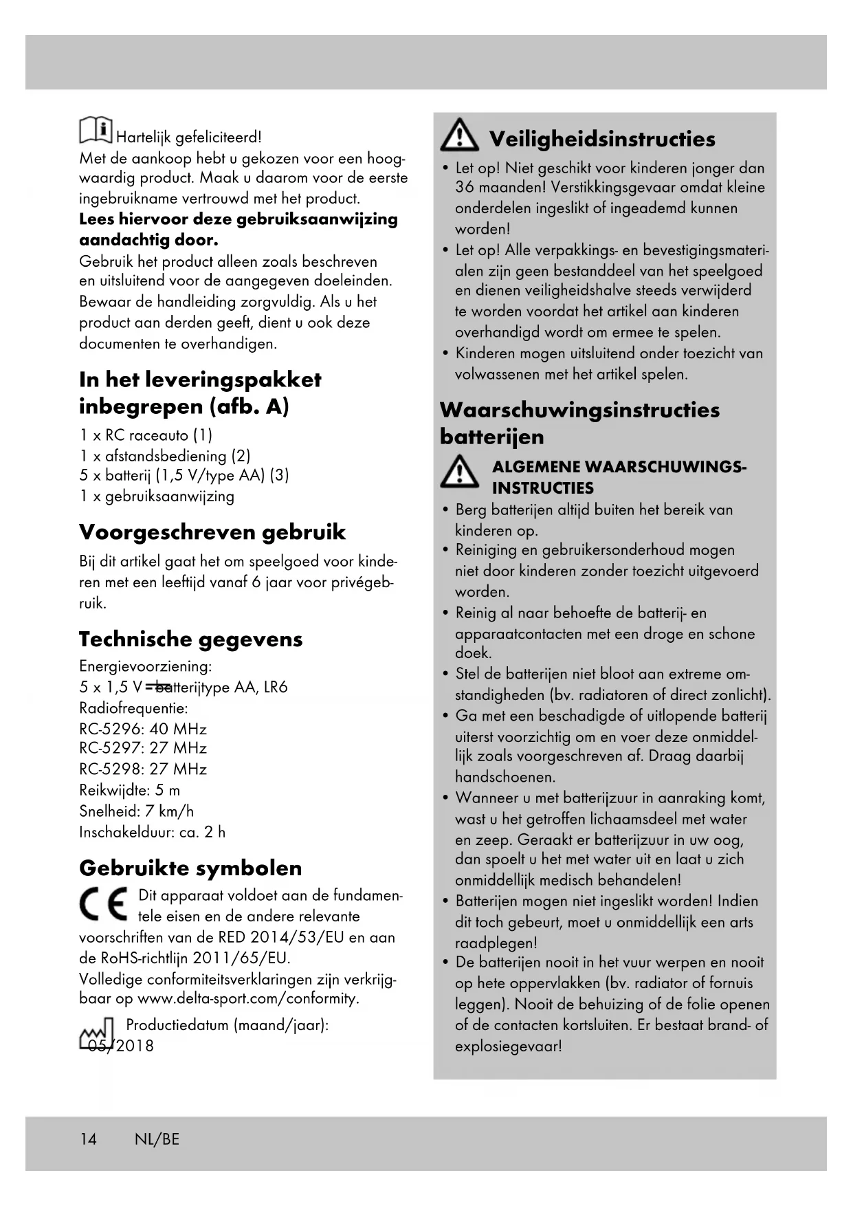 nog steeds niet rechtdoor rijdt. Opslag, reiniging Het artikel altijd droog en netjes in een op tempe- ratuur gebrachte kamer opbergen. Uitsluitend met water reinigen en vervolgens met een reinigings- doek droogvegen. BELANGRIJK! Nooit met chemische reinigings- middelen reinigen. Afvalverwerking Voer het artikel en verpakkingsmaterialen in overeenstemming met actuele lokale voorschriften af. Verpakkingsmaterialen, zoals bv. foliezakjes, horen niet thuis in kinderhanden. Berg het verpak- kingsmateriaal buiten het bereik van kinderen op. Apparaten die met het hiernaast afgebe- elde symbool gemarkeerd zijn, mogen niet samen met het huisvuil afgevoerd worden. U bent verplicht, dergelijke oude elektrische en elektronische apparaten afzonderlijk af te voeren. Gelieve bij uw gemeentebestuur naar de mogelijkheden van een reguliere afvalverwijde- ring te informeren. Verwijder de batterij uit het artikel vóór de afvoer. Verwijderingsmaatregelen batterijen In acht nemen a.u.b.: Omdat het bij batterijen om bijzonder afval gaat dat volgens de wet niet samen met het huisvuil afgevoerd mag worden. U kunt onbruikbare batterijen op de gemeentelijke inzamelpunten of in de handel afgeven. Hier staan speciale verzamelbakken ter beschikking. Opmerkingen over garantie en serviceafhandeling Het product is geproduceerd met grote zorg en onder voortdurende controle. U ontvangt een garantie van drie jaar op dit product, vanaf de datum van aankoop. Bewaar alstublieft uw aankoopbewijs. De garantie geldt alleen voor materiaal- en fabricagefouten en vervalt bij foutief of oneigen- lijk gebruik. Uw wettelijke rechten, met name het garantierecht, worden niet beïnvloed door deze garantie. In geval van reclamaties dient u zich aan de beneden genoemde service-hotline te wenden of zich per e-mail met ons in verbinding te zetten. Onze servicemedewerkers zullen de verdere han- delswijze zo snel mogelijk met u afspreken. Wij zullen u in ieder geval persoonlijk te woord staan. De garantieperiode wordt na eventuele reparaties en op basis van de garantie, wettelijke garantie of coulance niet verlengd. Dit geldt ook voor ver- vangen en gerepareerde delen. Na afloop van de garantieperiode dienen eventuele reparaties te worden betaald. IAN: 302451 Service België Tel.: 070 270 171 (0,15 EUR/Min.) E-Mail: deltasport@lidl.be Service Nederland Tel.: 0900 0400223 (0,10 EUR/Min.) E-Mail: deltasport@lidl.nl NL/BE17 Srdečně blahopřejeme! Vaší koupí jste se rozhodli pro jakostní produkt. Před uvedením do provozu se nejdříve seznamte s celým produktem. Přečtěte si pozorně následující návod k obsluze. Používejte produkt jen tak, jak je popsáno a jen v doporučených oblastech. Uschovejte si tento návod. Při předávání produktu třetí osobě předávejte i všechny příslušné podklady. Rozsah dodávky (obr. A) 1 x RC závodní auto (1) 1 x dálkové ovládání (2) 5 x baterie (1,5 V/typ AA) (3) 1 x návod k obsluze Použití ke stanovenému účelu Tento výrobek je hračka pro děti od 6 let pro privátní použití. Technické údaje Napájení energií: 5 x 1,5 V baterie typu AA, LR6 Radiová frekvence: RC-5296: 40 MHz RC-5297: 27 MHz RC-5298: 27 MHz Dosah: 5 m Rychlost: 7 km/h Doba chodu: cca 2 h Použité symboly Tento přístroj odpovídá ohledně shody základním požadavkům a ostatním relevantním předpisům směrnice RED 2014/53/ EU a směrnice RoHS- 2011/65/EU. Úplná prohlášení o shodě lez získat na www.delta-sport. com/conformity. Datum výroby (měsíc/rok): 05/2018 Bezpečnostní pokyny