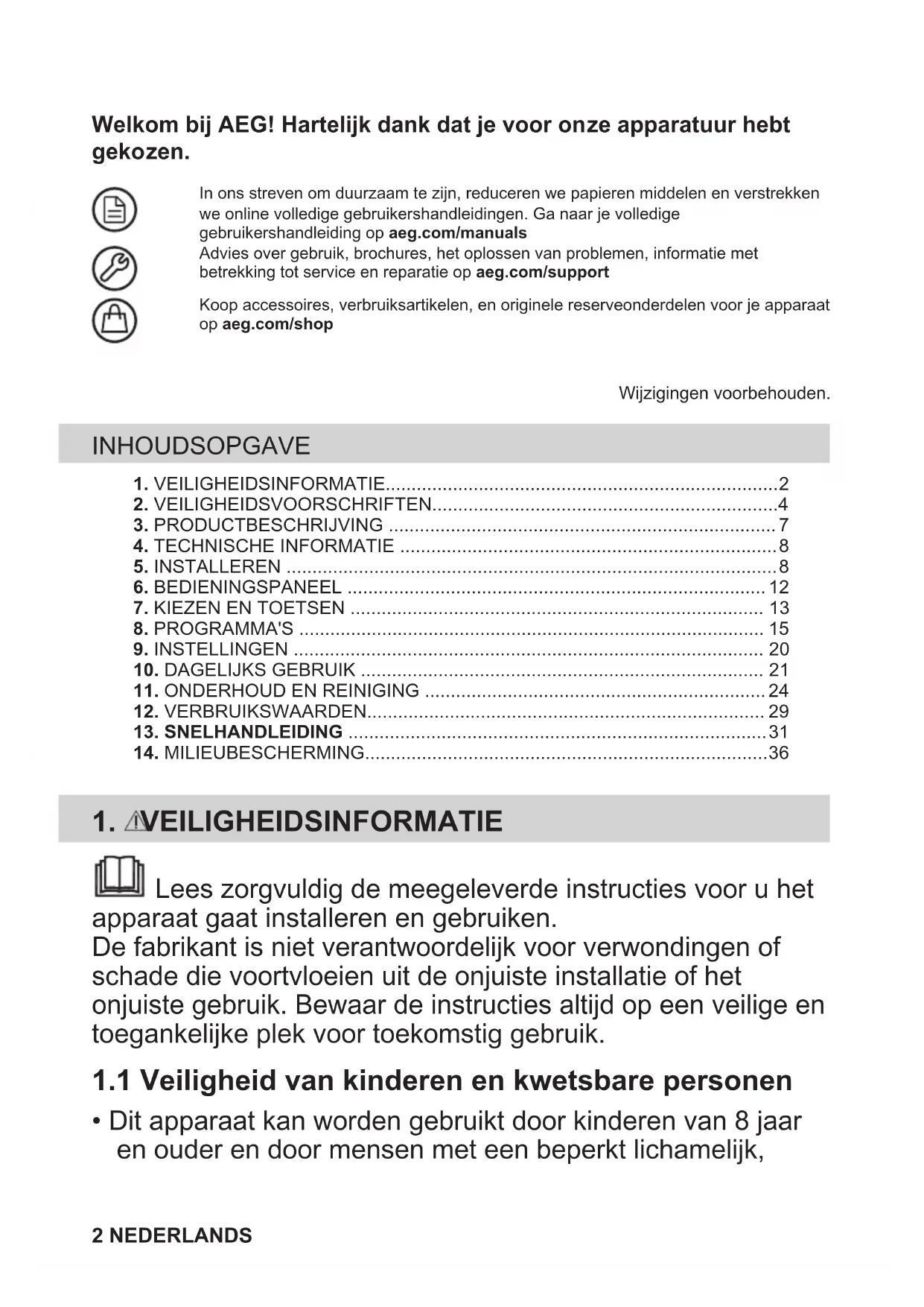 - Wacht totdat de stroomtoevoer stabiel is. Als het probleem aanhoudt, neemt dan contact op met een erkende servicedienst. De contactgegevens van de servicedienst staan op het typeplaatje *Sommige alarmcodes komen mogelijk niet voor. Onderhevig aan wijziging zonder kennisgeving. NEDERLANDS 3514. MILIEUBESCHERMING Recycleer de materialen met het symbool . Gooi de verpakking in een geschikte afvalcontainer om het te recycleren. Bescherm het milieu en de volksgezondheid en recycleer op een correcte manier het afval van elektrische en elektronische apparaten. Gooi apparaten gemarkeerd met het symbool niet weg met het huishoudelijk afval. Breng het product naar het milieustation bij u in de buurt of neem contact op met de gemeente. 36 NEDERLANDSWelcome to AEG! Thank you for choosing our appliance. In our drive to be sustainable, we are reducing paper assets and provide full usermanuals online. Access your full user manual at aeg.com/manualsGet usage advice, brochures, troubleshooting, service and repair information at aeg.com/supportBuy accessories, consumables, and original spare parts for your appliance at aeg.com/shopSubject to change without notice. CONTENTS