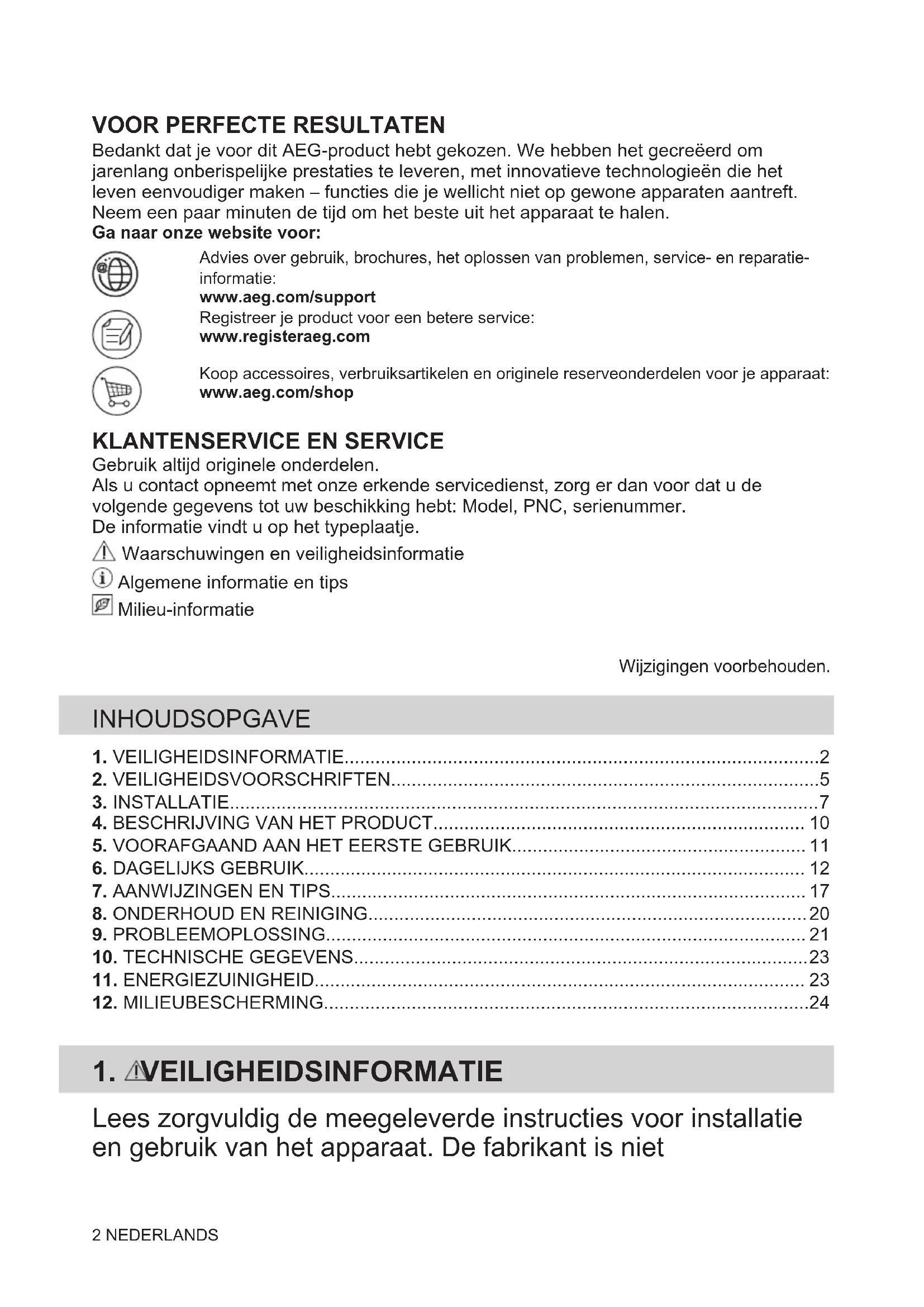 Bedankt dat je voor dit AEG-product hebt gekozen. We hebben het gecreëerd om jarenlang onberispelijke prestaties te leveren, met innovatieve technologieën die het leven eenvoudiger maken – functies die je wellicht niet op gewone apparaten aantreft. Neem een paar minuten de tijd om het beste uit het apparaat te halen. Ga naar onze website voor:Advies over gebruik, brochures, het oplossen van problemen, service- en reparatie-informatie:www.aeg.com/supportRegistreer je product voor een betere service:www.registeraeg.comKoop accessoires, verbruiksartikelen en originele reserveonderdelen voor je apparaat:www.aeg.com/shop
