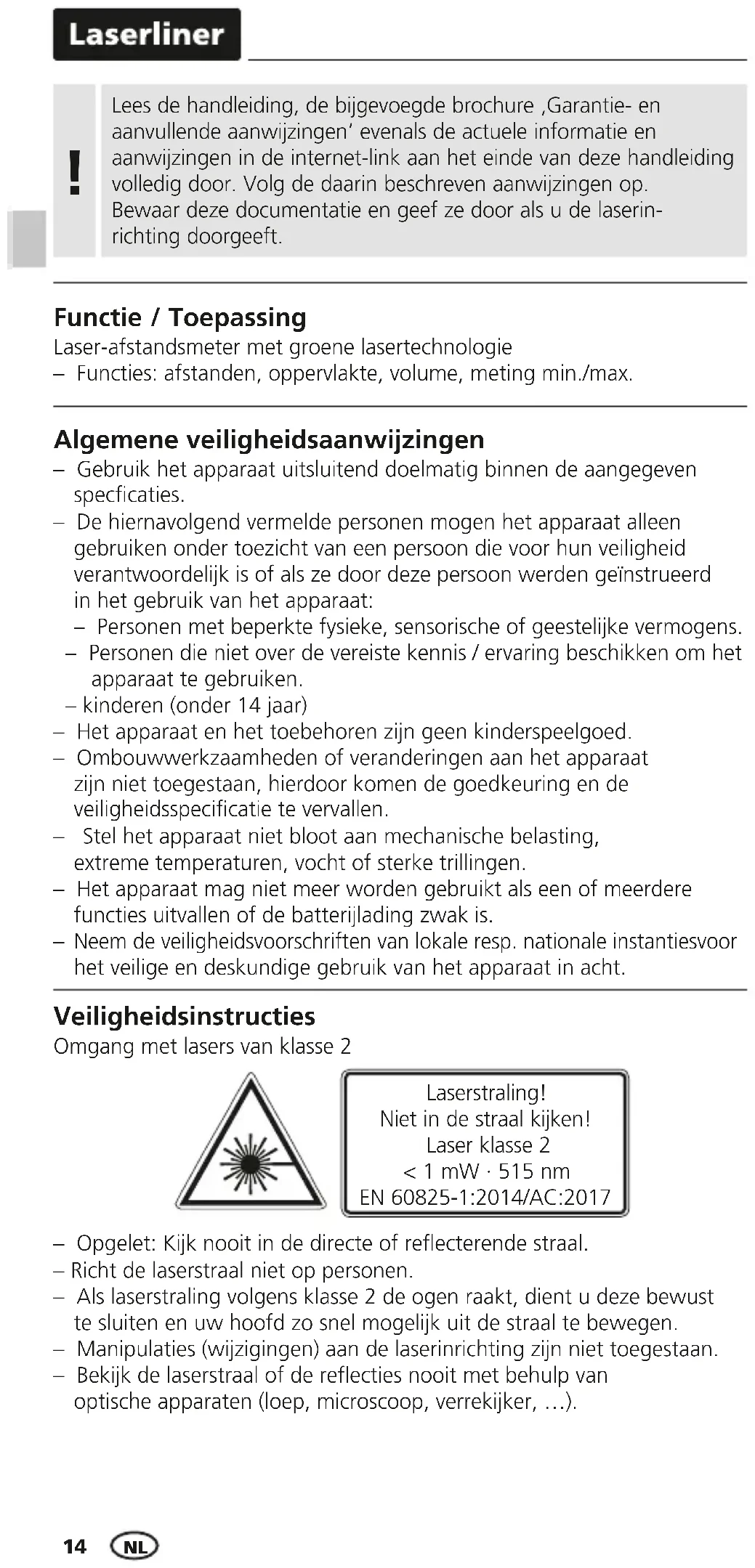 Neem de veiligheidsvoorschriften van lokale resp. nationale instantiesvoor het veilige en deskundige gebruik van het apparaat in acht. Laser-afstandsmeter met groene lasertechnologie – Functies: afstanden, oppervlakte, volume, meting min./max. Functie / Toepassing Lees de handleiding, de bijgevoegde brochure ‚Garantie- en aanvullende aanwijzingen‘ evenals de actuele informatie en aanwijzingen in de internet-link aan het einde van deze handleiding volledig door. Volg de daarin beschreven aanwijzingen op. Bewaar deze documentatie en geef ze door als u de laserin- richting doorgeeft.